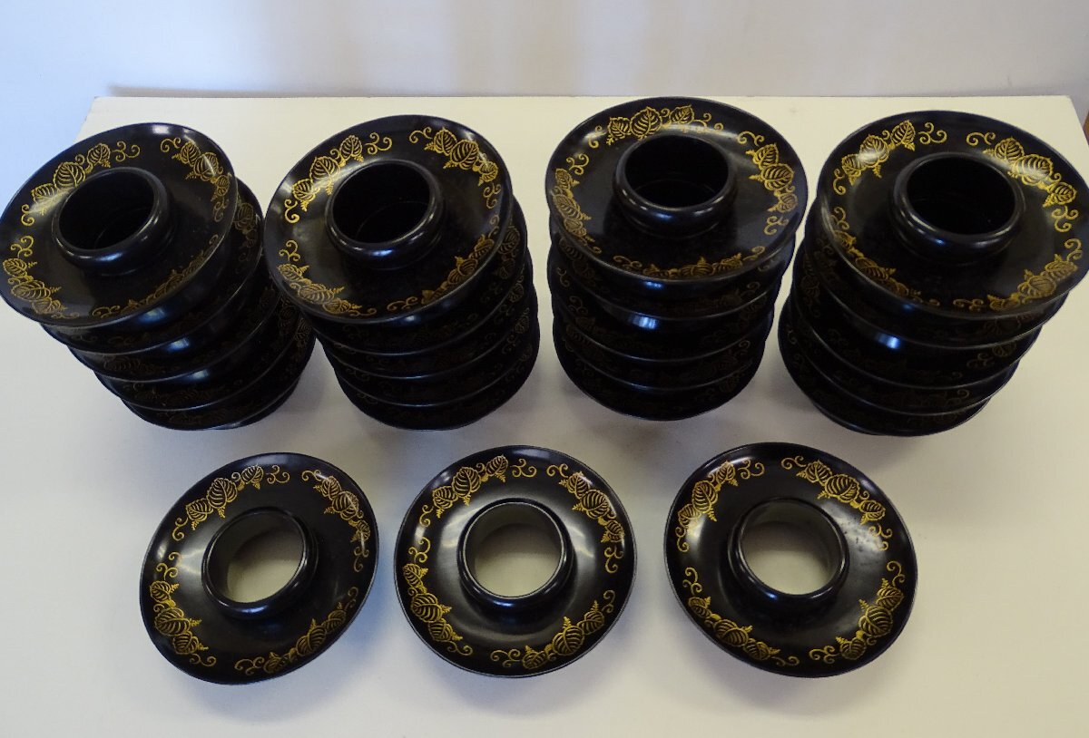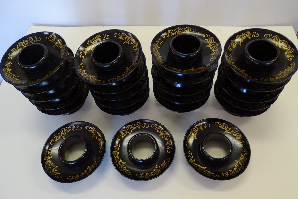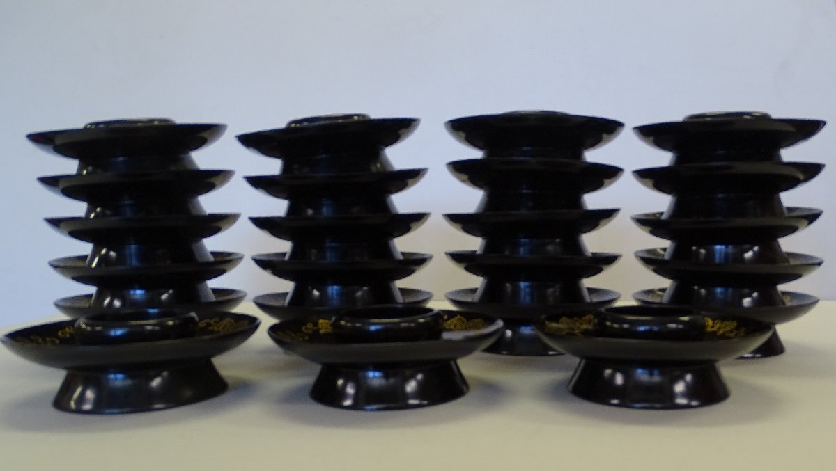 ・品名: 金蒔絵小皿台(23点セツト)・素材: 天然木 ・技法:金蒔絵・サイズ:高さ:20㎝×32㎝・NO-R7-1-13.8