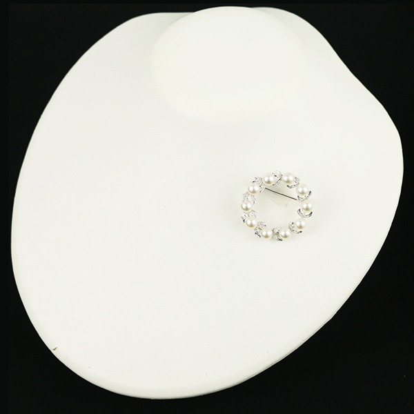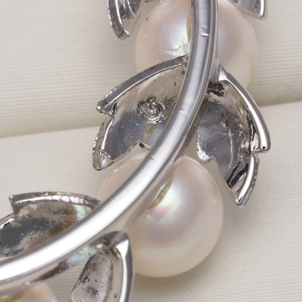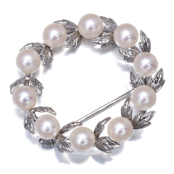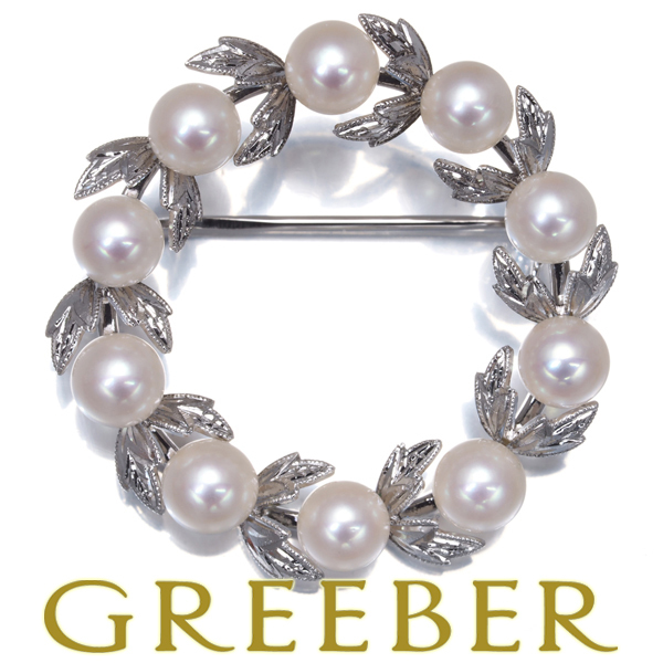 ホワイト系のお色味に仄かなピンクの干渉色を浮かべるテリ艶が神秘的な美しさを醸し出す ミキモト厳選アコヤ真珠のブローチ。細やかなミルグレイン細工で丁寧に描かれたリーフの煌めきも美しい一品ですよ。 |