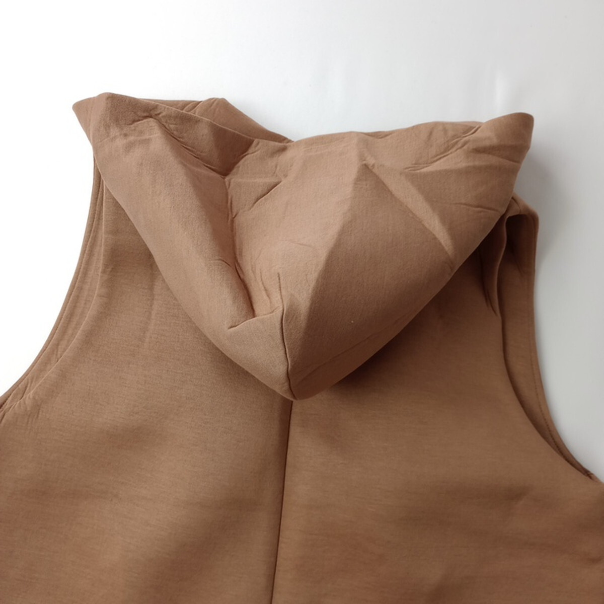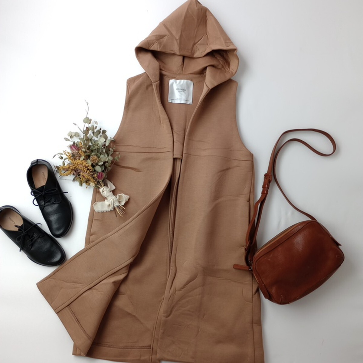 【特徴】フードを備えたロングジレで、胸元の切り替えにより軽やかな印象を持たせたデザインです。すっきりとしたシルエットで、羽織るだけで縦のラインを強調しやすい点が特長です。フードは実用性を高めつつ、着こなしの幅を広げるポイントとして活躍します。