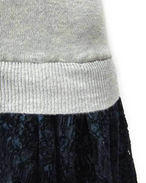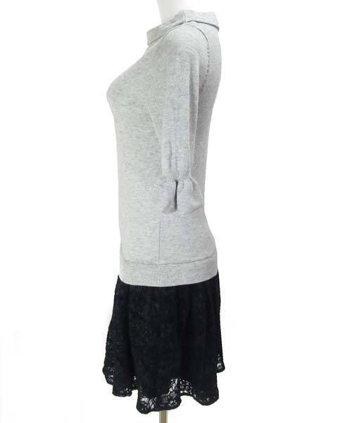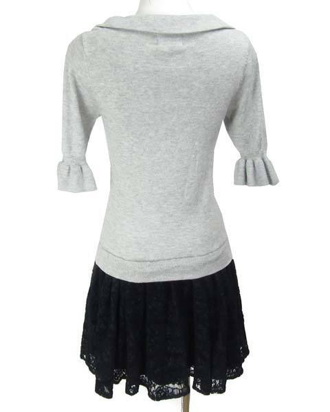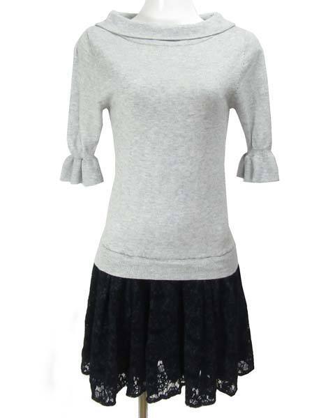 | ニットとべロア風レースの切り替えワンピースです。折り返しボートネックとお袖のフレアも可愛いです。重く見える下半身部分もふんわりレースで軽やかです。女子会などにもピッタリですよ。 |