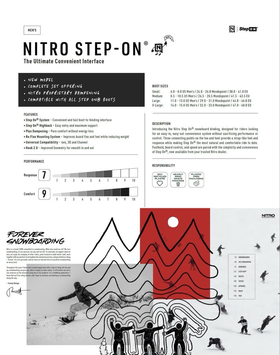 パフォーマンスやコントロール性を犠牲にすることなく、着脱が簡単なシステムを求めるライダーのために設計されています。つま先とかかとの3つの接続ポイントがストラップのような感触とレスポンスを提供し、Step On はこれまでで最も自然で快適な乗り心地を実現します。足場の安定性、ボードコントロール、そしてスピード。Step On のシンプルさと利便性が融合したこのバインディングは、Nitro 正規代理店で今すぐお求めいただけます。