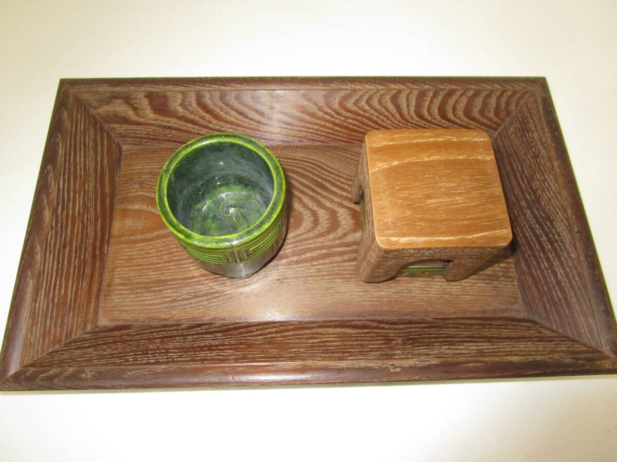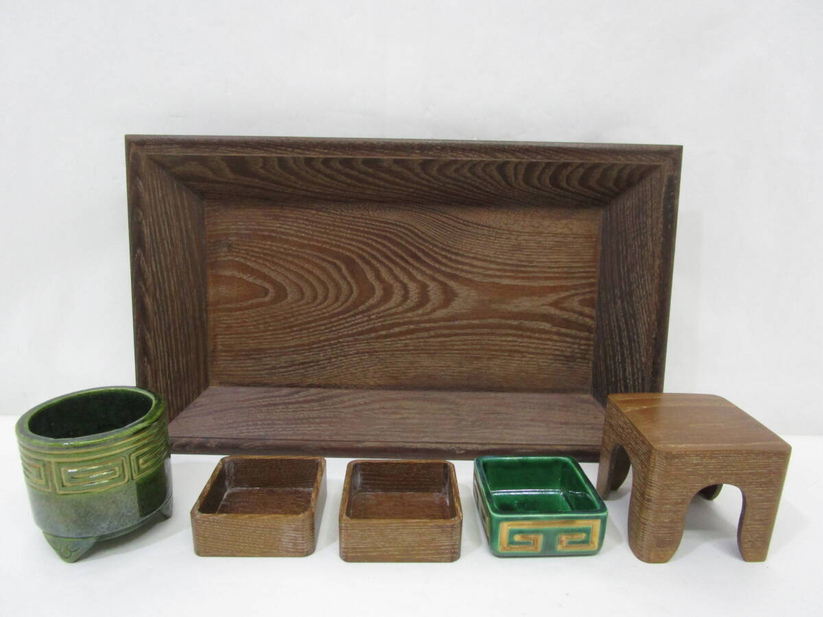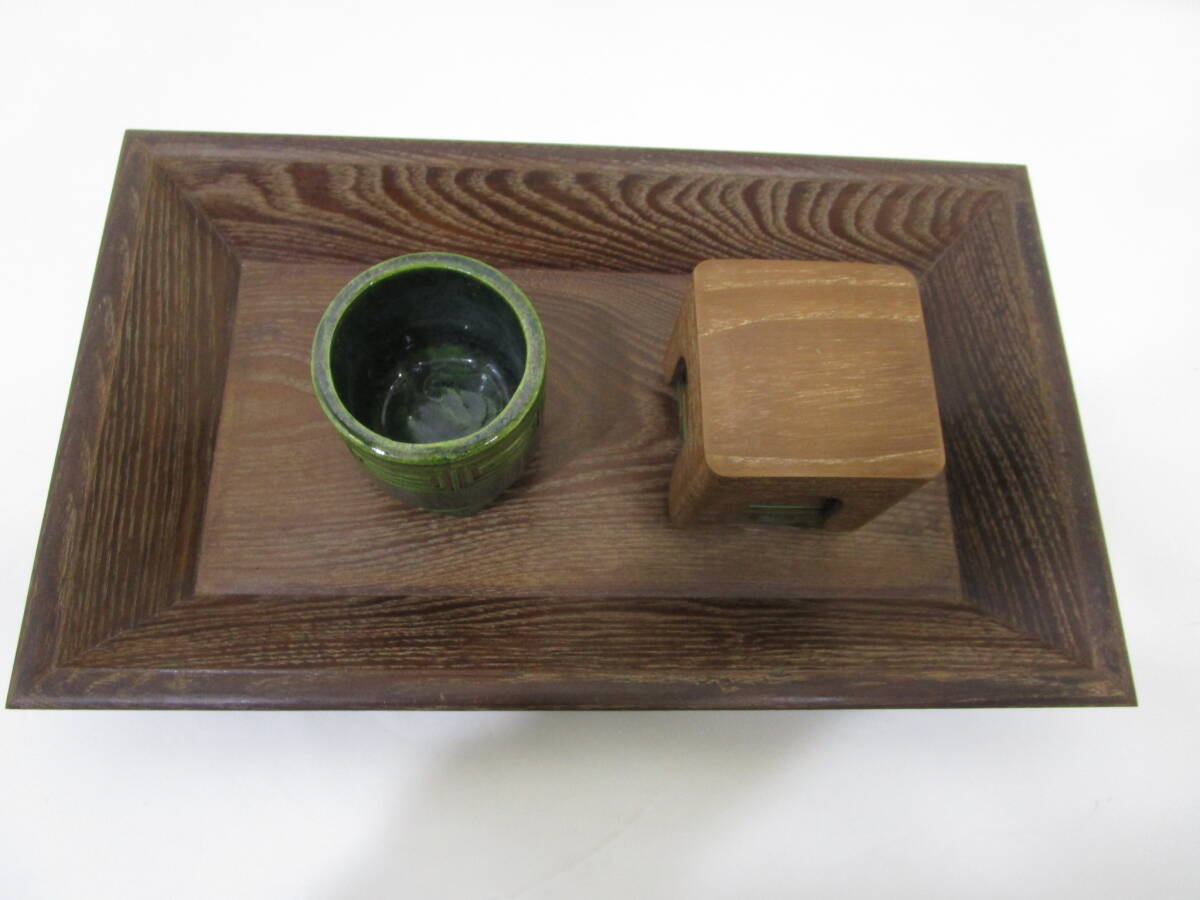 サイズ:「桑香盆」横幅37.5cm 奥行 22.5cm 高さ 4cm 「伊東桂楽作 青楽火入」の径7.3cm 高さ7.2cm 「桑重香合・川崎和楽作」 7.5cm四方 高さ8cm