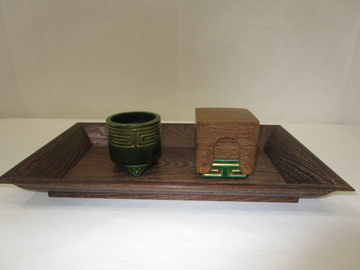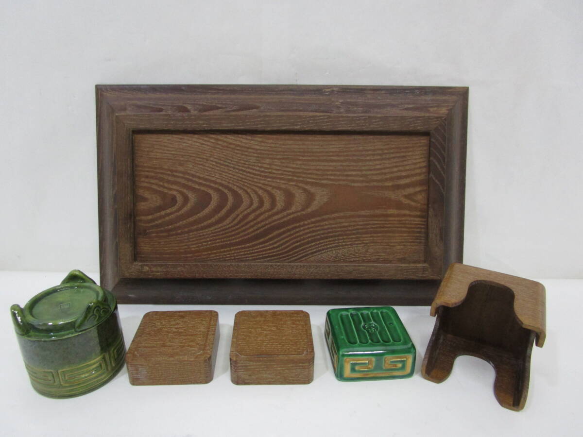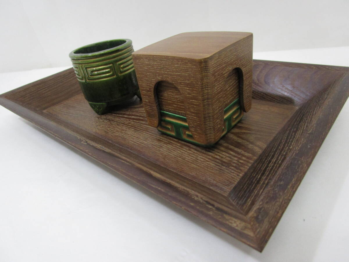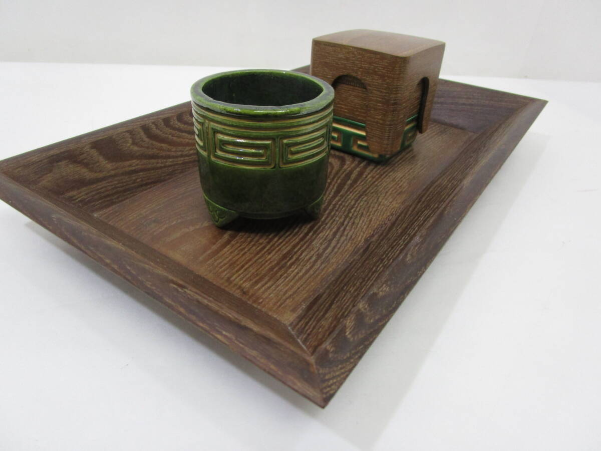 サイズ:「桑香盆」横幅37.5cm 奥行 22.5cm 高さ 4cm 「伊東桂楽作 青楽火入」の径7.3cm 高さ7.2cm 「桑重香合・川崎和楽作」 7.5cm四方 高さ8cm