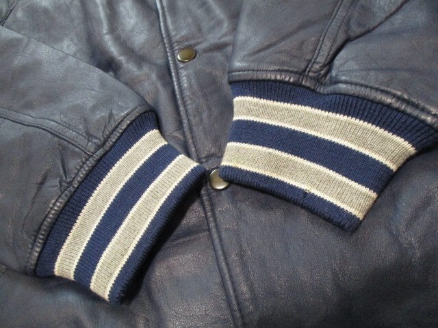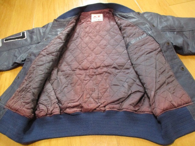 ☆サイズ:フリー ※ゆったりサイズですので、実寸ご参照ください ☆実寸(素人採寸のため若干の誤差はご容赦下さい): 着丈;約68cm、身幅;約70cm、裄丈(背面襟元中央~袖先);約86cm ☆カラー:ネイビー ☆素材:表地;牛革 裏地;ナイロン50%、アセテート50% 中綿;ポリエステル100% ☆状態:経年モデルのため、薄汚れや裏地の変色、左袖リブに1ヶ所(5mm程度)の解れはございますが、使用頻度は少なく、目立つ汚れや破損もなく、この年代の物としましては、状態は良好かと思います。 |