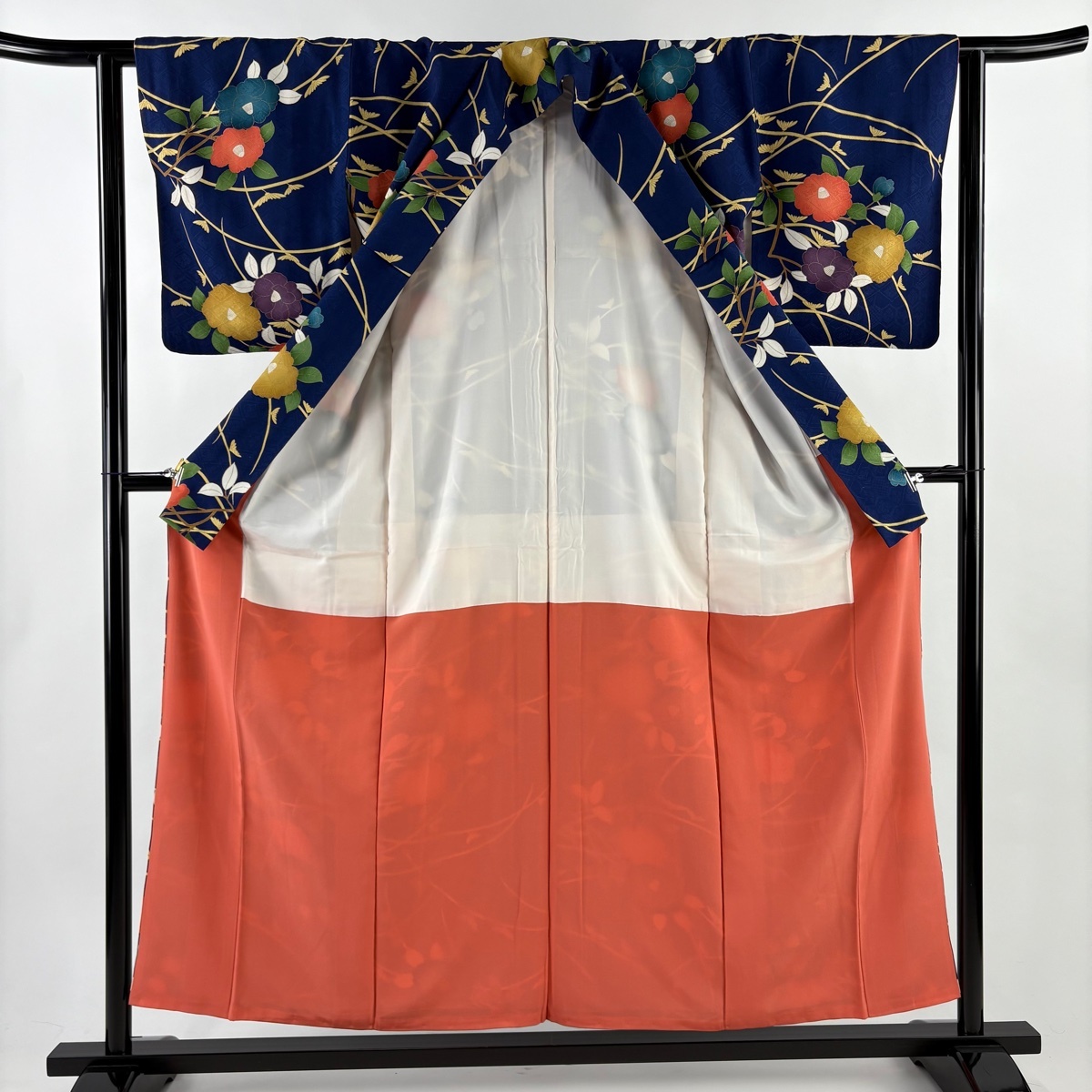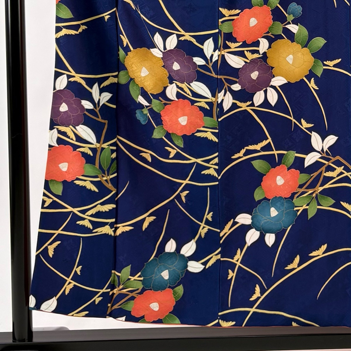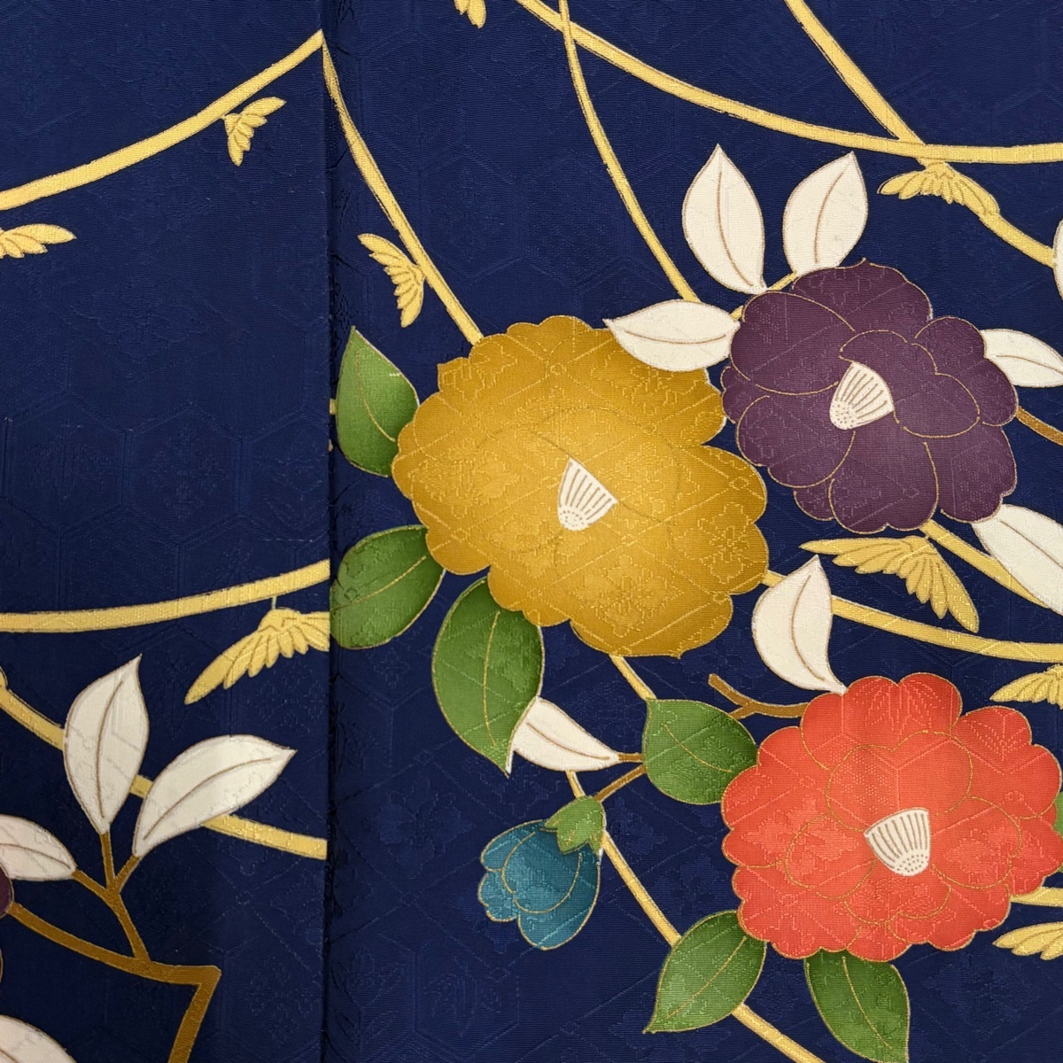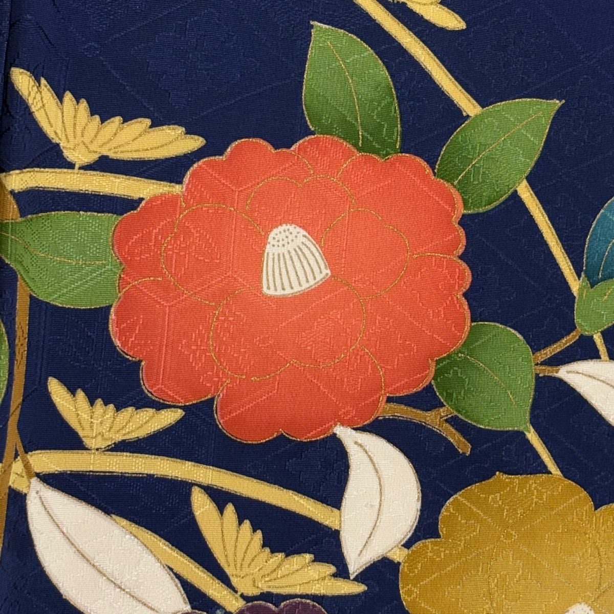 | 小紋 秀品 椿 地紋 金彩 紺色 袷 身丈156 裄丈62.5 S 正絹 【中古】 |