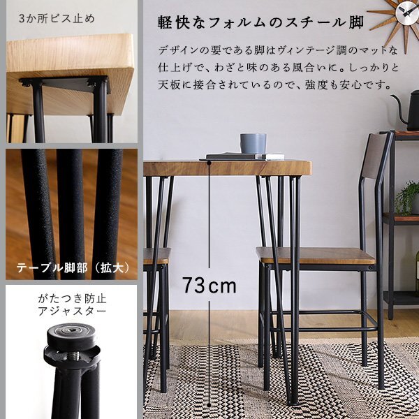 【カラー】 シャビーオーク、ウォールナット 【サイズ】 テーブル:W75×D56×H73cm 椅子:W38×D44×H81cm 【重量】 テーブル:6.5kg 椅子:3.8kg(1脚) 【素材】 主材:スチール MDF 表面加工:粉体塗装 PVC 【耐荷重】 テーブル:100kg チェア(1脚):100kg 【梱包】 サイズ:W89×D62×H18cm、重量:16.2kg 【組み立て品】 お客様による組み立てが必要です。 【ご注意】 ・サイズ、重量は概算です。 ・商品カラーはご使用のモニターによって実際の明るさや色と異なって見える場合がございます。 |