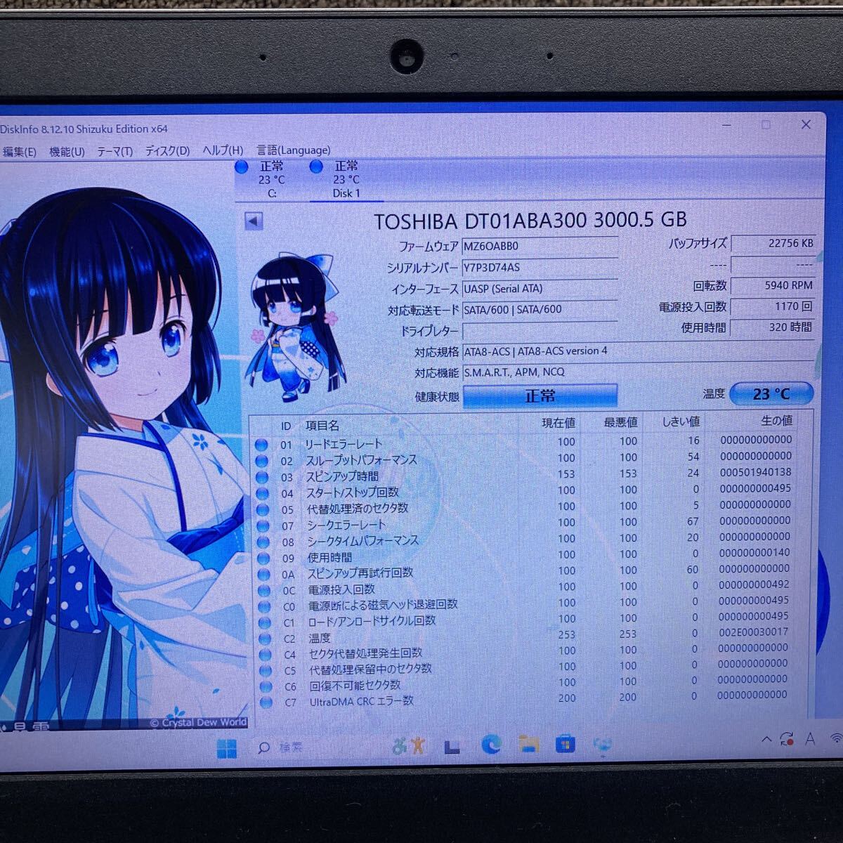 HDD-5216 激安 HDD3TB 3.5インチ SATA 320時間 内蔵HDD TOSHIBA DT01ABA300 Crystaldiskinfoにて正常品 中古