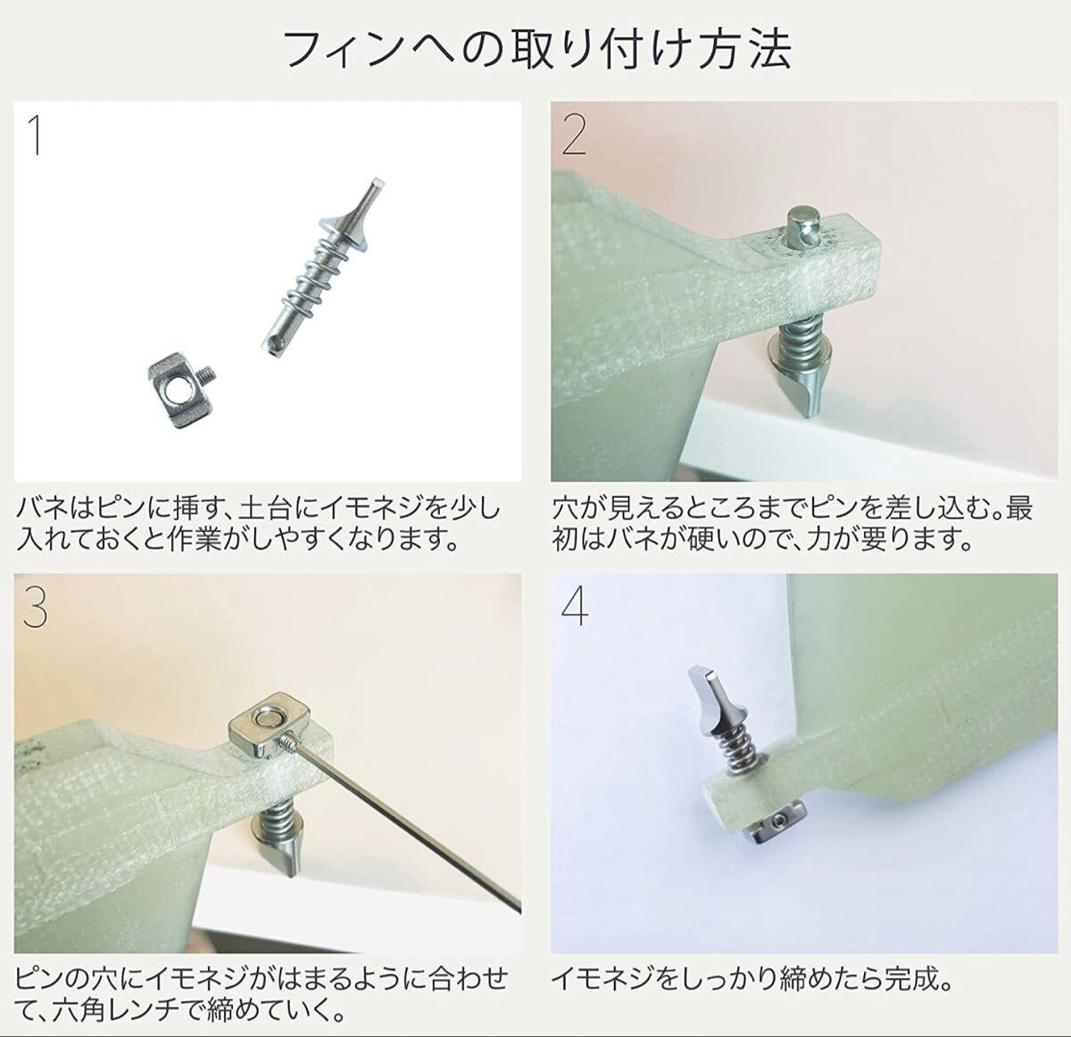 ロングボードやミッドレングスボード、SUP等のセンターフィンに取り付けておくことで、フィンボックスにプレートを入れて位置を調節、ネジを締める手間から解放。 波乗り前後の、フィンの着脱をスムーズにします。 商品画像の取付方法を参考に、設置・使用してください。(使用開始時にはバネが硬くなっておりますので、怪我に気をつけて作業してください)