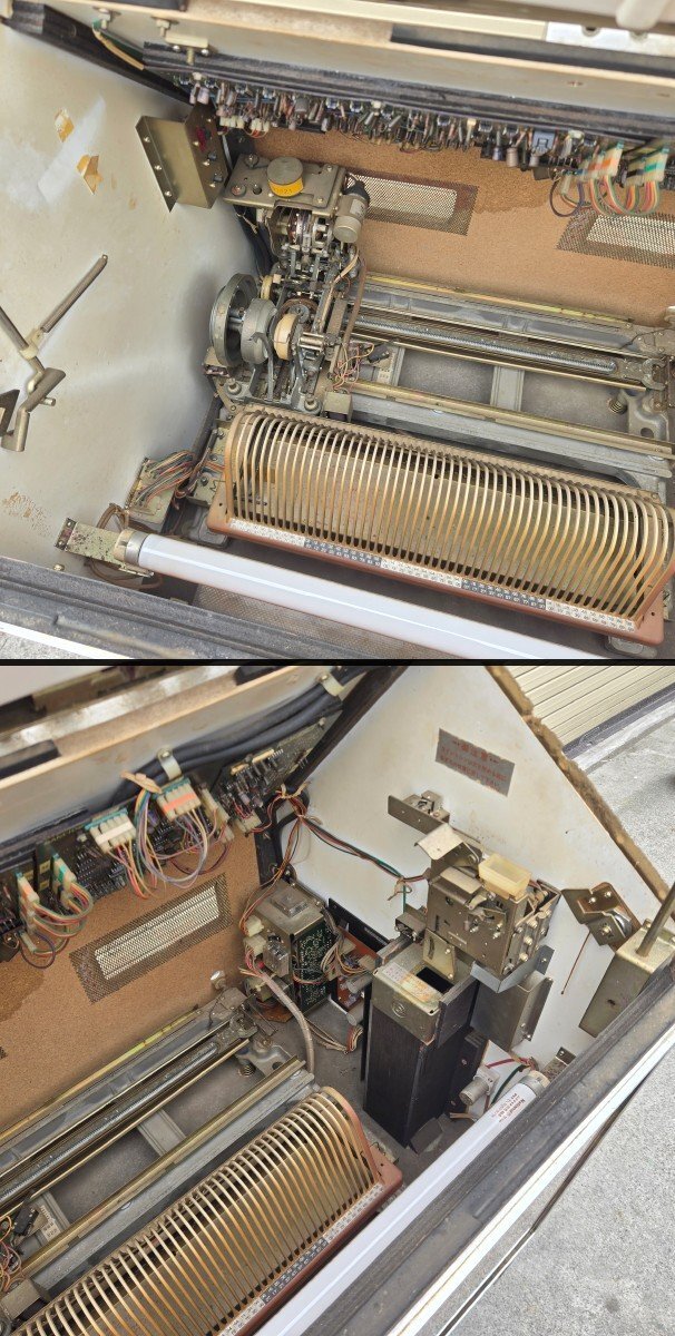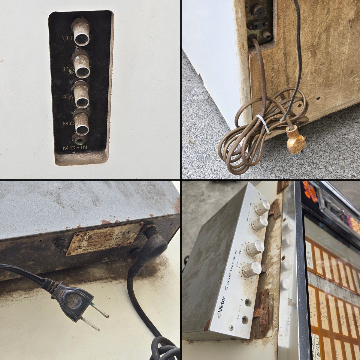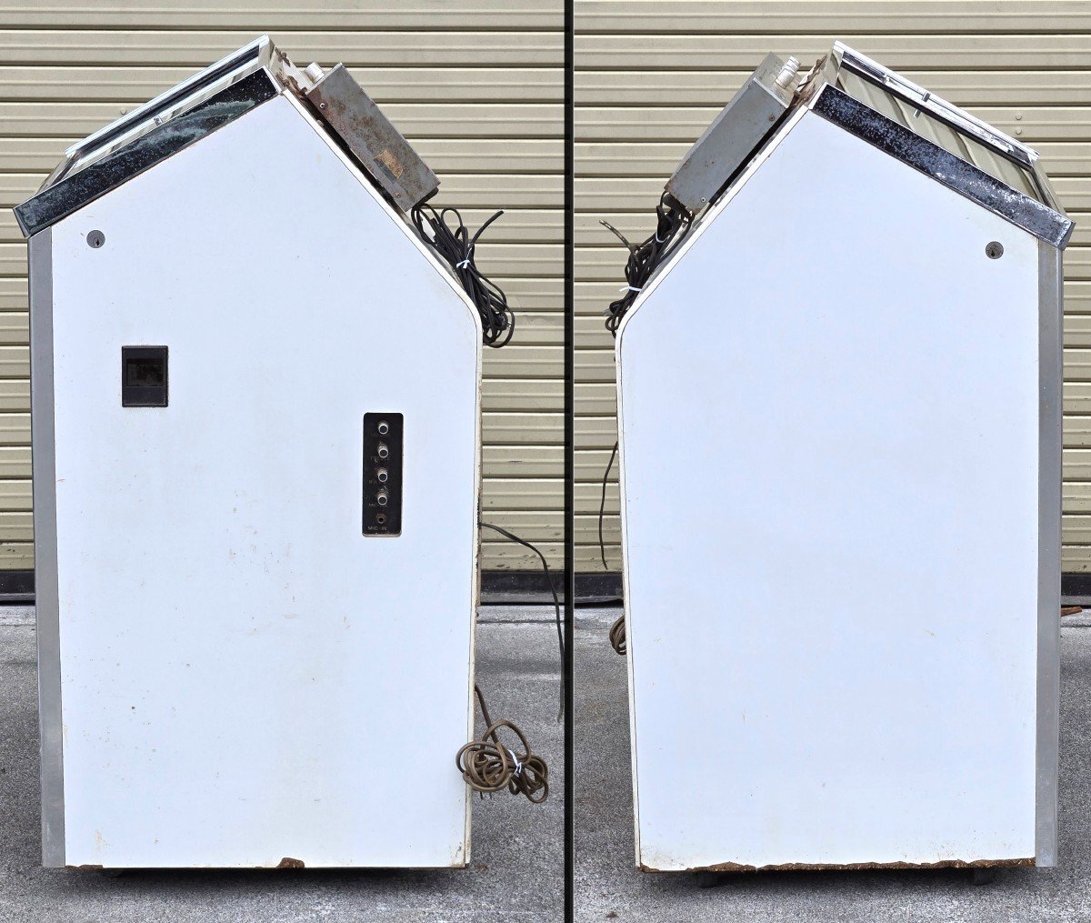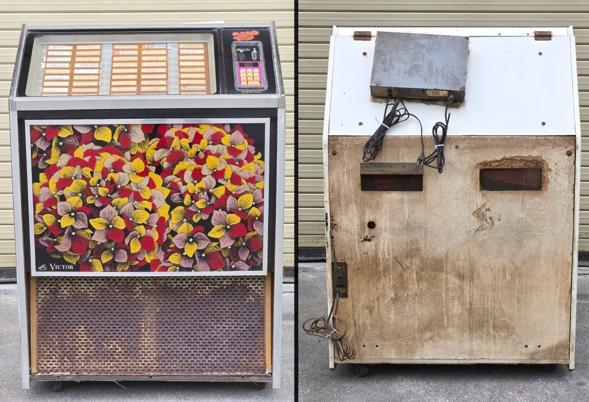 Victorのジュークボックスが入荷致しました。 傷や汚れなどの中古の使用感が全体的に見られ、 特に木材部分の劣化が進んでいます。 蛍光灯の点灯と、一部モーターの回転は確認できましたが、 レコード選択ボタンの接触が悪くなっており、 レコードの取り出し・再生の動作は確認できませんでした。 また、鍵が付属しておらず、コインボックスが開きません。 修理や部品取り前提のジャンク品としての出品となりますので、 ご了承の上、ご入札ください。 付属品はレコード盤12枚と、取り扱い説明書になります。 詳しい商品状態・仕様につきましては写真よりご確認下さい。 この機会に是非ご検討宜しくお願い致します。 【当アメNETでは】 出品する際の工具や業務用品、他の商品におきまして、清掃(吹き上げ)や動作確認をおこなっておりますが、 骨董・アンティークに関しては雰囲気を損なわないよう、最小限の清掃に留まらせて頂いております。 |
