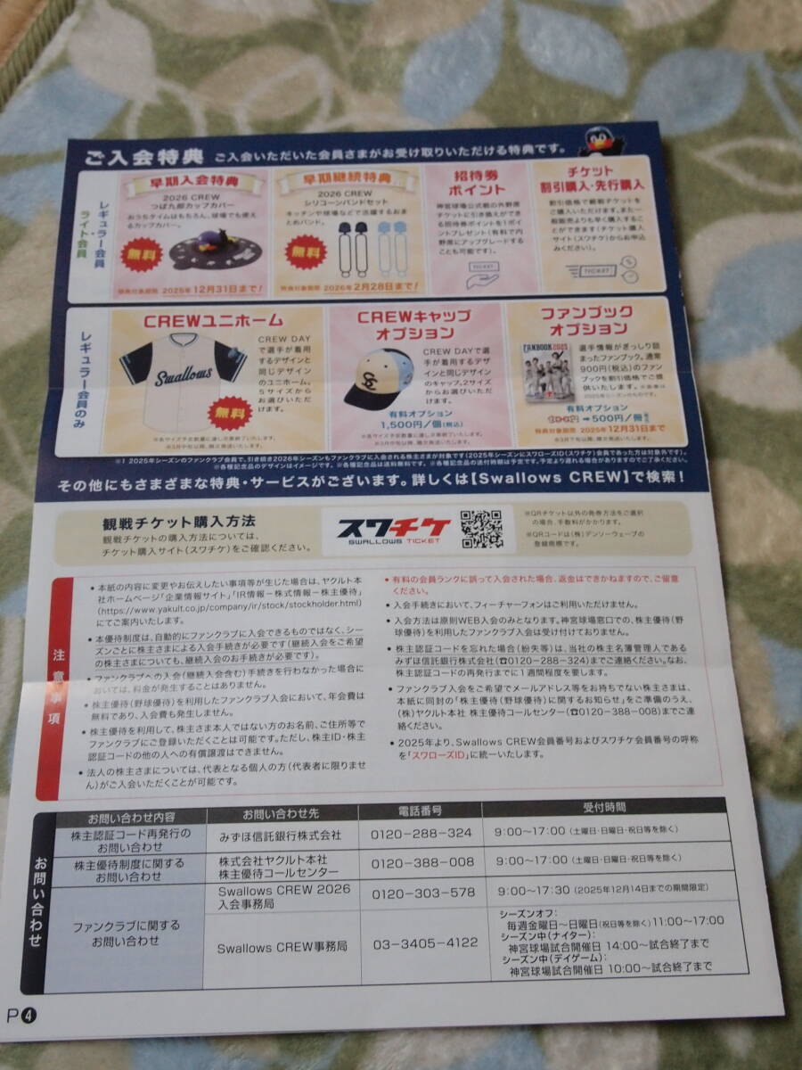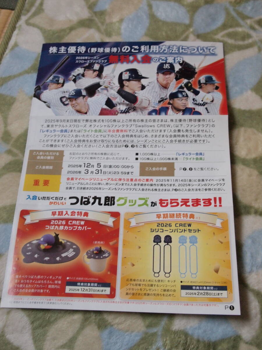 ■ヤクルト 株主優待 (野球優待)スワローズファンクラブ  会員 入会権 ■
