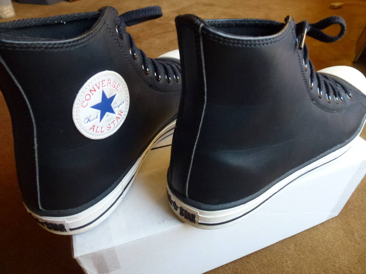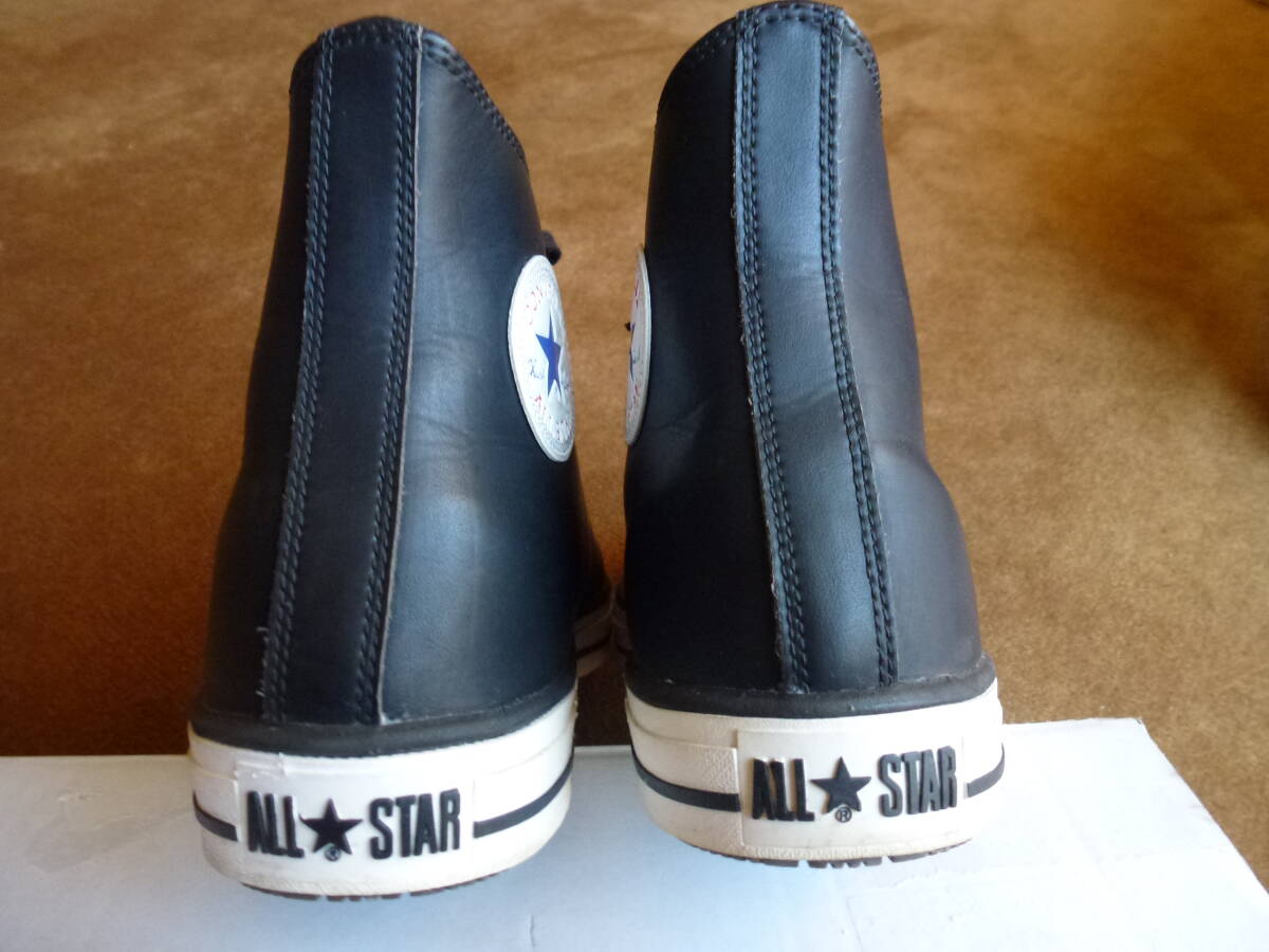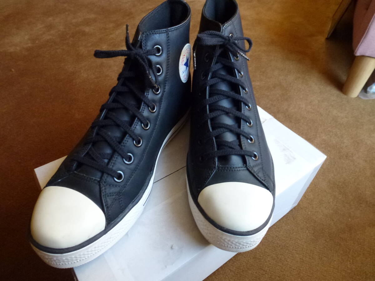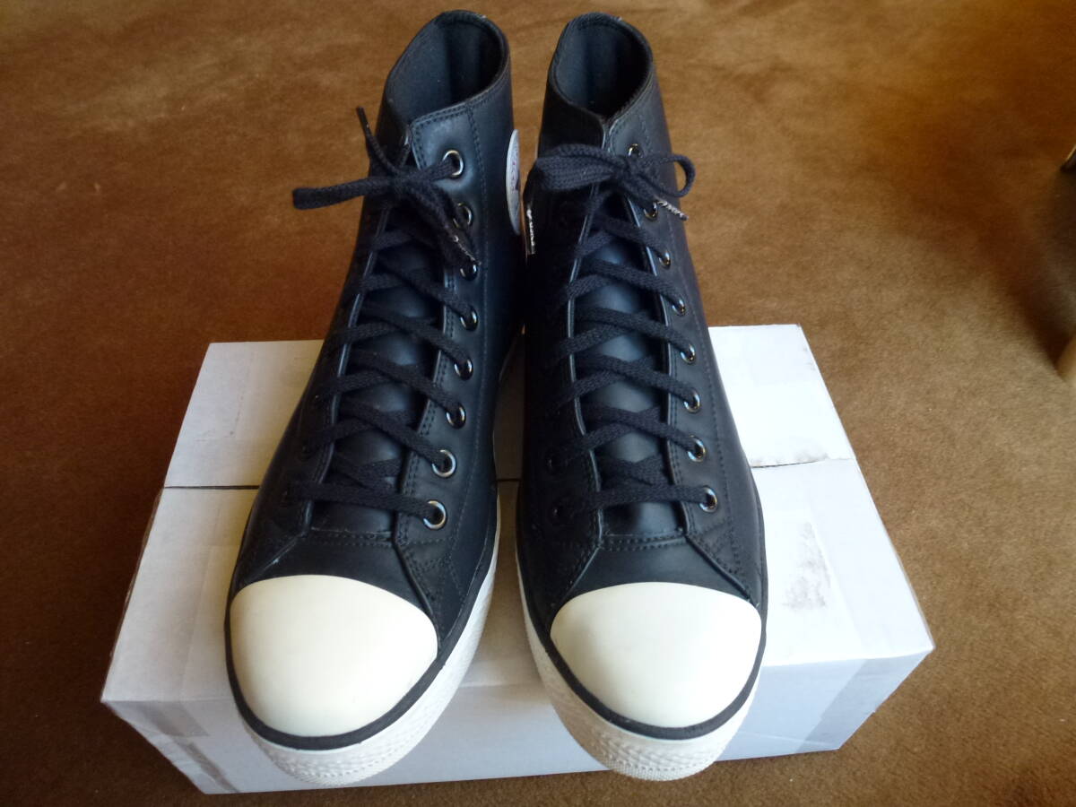 コンバースのオールスターです。色はブラック、アッパーの素材は合成皮革で、サイズはUSサイズの9.5、日本サイズで28.0cmです。新品で購入し、1度、30分ほど履いただけです。しかも車で移動しただけですから、ほとんど新品に近い美品です。合成皮革なので雨に濡れても安心ですし、とても軽くて履きやすいので疲れません。見た感じは天然皮革のようです。購入時に外箱を捨ててしまったので、何か別の箱に入れて発送致します。新品同様の美品ですから特に問題はないと思いますが、格安処分ですのでノークレーム、ノーリターンでお願い致します。評価の悪い方、オークション新規登録の方、細かい事を気になさる神経質な方などは入札を御遠慮下さい。宜しくお願い致します。