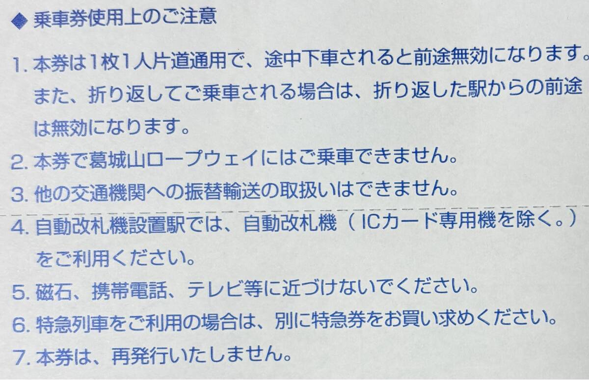 1.本券は1枚1人片道通用で、途中下車されると前途無効になります。