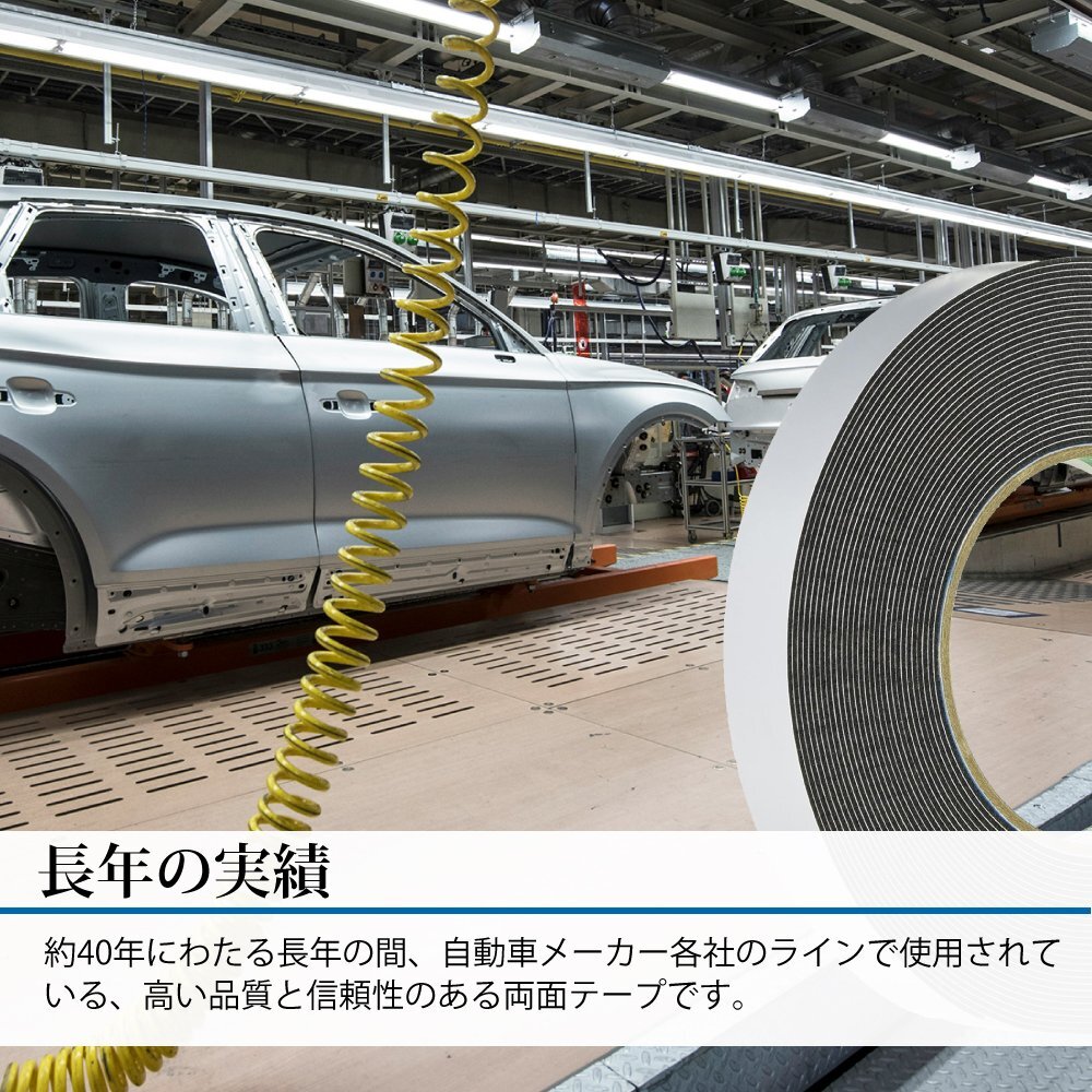 | 最強接着!!ハイタック97シリーズ ・約40年間の長年に渡り自動車メーカーで採用されている製品。 ・接着しにくい塗膜に良くつき、安定した接着力。 ・耐可塑剤性、耐薬品性に優れており、高い品質と信頼性。 ・初期接着性・耐候性・耐溶剤性に優れ長期間、高い接着力を発揮。 ・対候性・耐久性に優れ、長期間高い接着力を維持。 ・テープ基材が柔らかく部品やボデー等の曲面、凹凸部になじみ、しっかり接着。 ・基材を黒色に加工しているため、ブラックアウト部位などへの透明部品に使用してもテープが目立たない。 | |