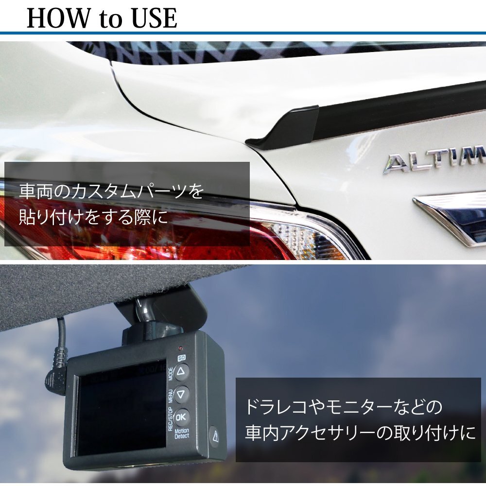 | ・バンパーモール、バンパープロテクターの接着 ・透明サイドバイザーの接着 ・各種内外装部品やアクセサリー等の接着 ・ドラレコやモニターなどの車内アクセサリーの取り付けに ・作業灯やセンサーライトなどの取り付けに ・ポストや壁掛けフックなどの取り付けに | |