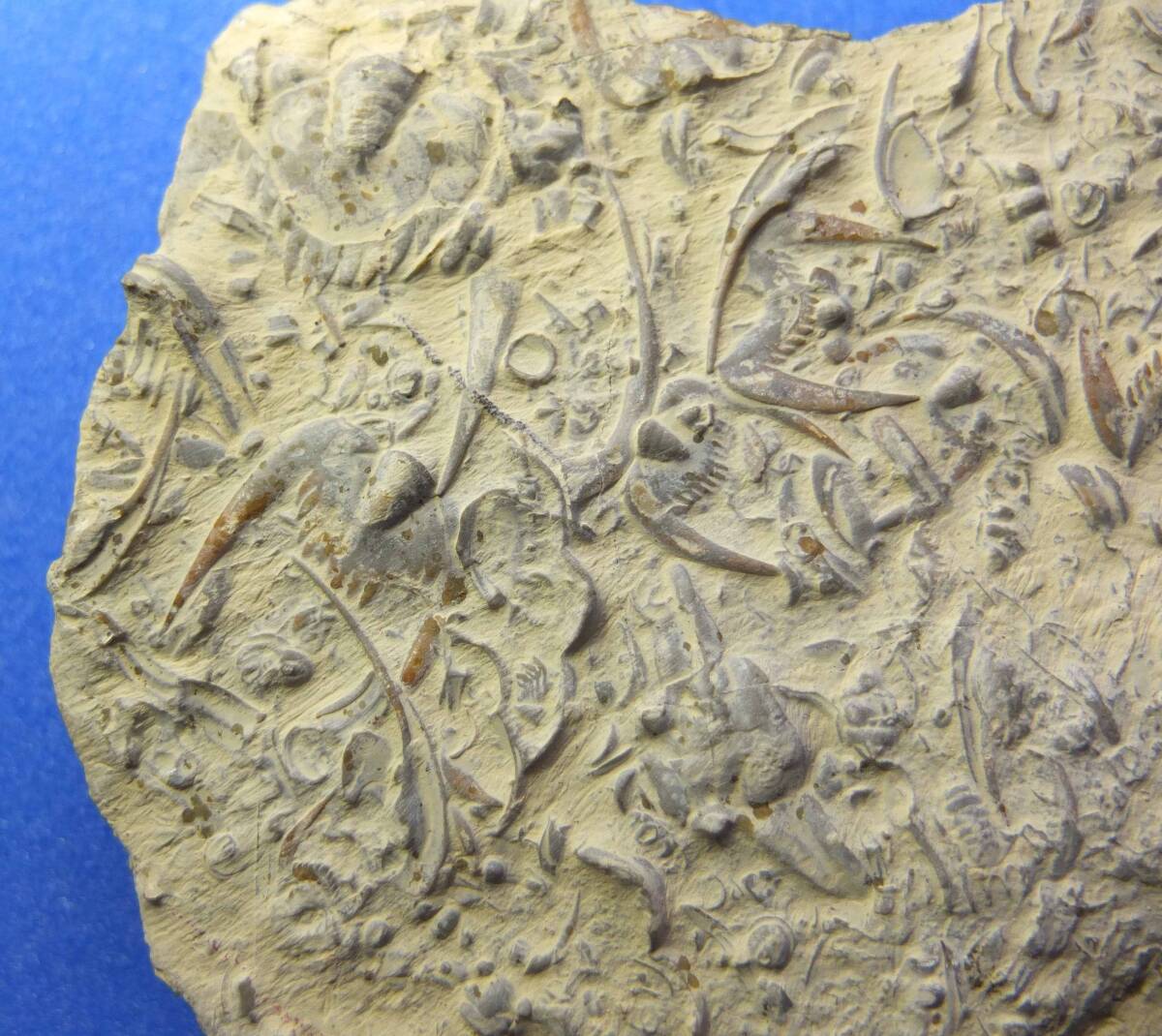 尾板などの部分化石の集合体です。尾板の形がコウモリの飛んでいる姿に見えるため,