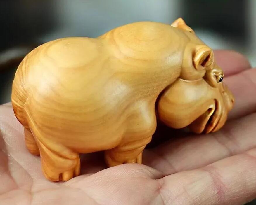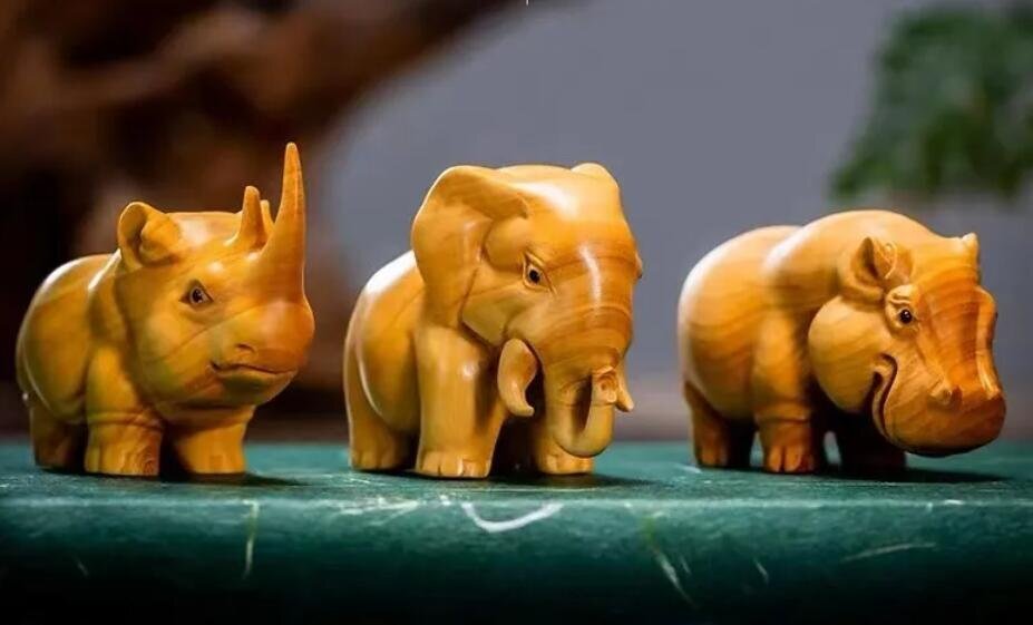 黄楊木木彫りサイ、カバ、象