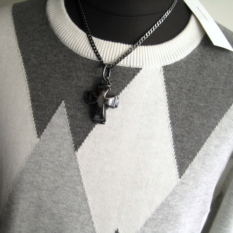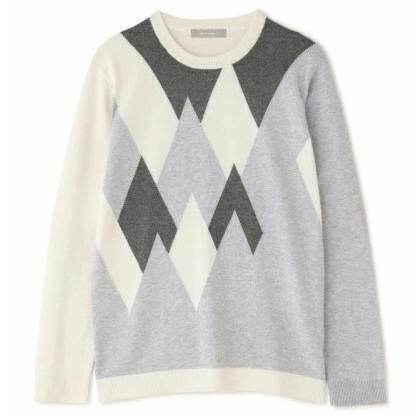 ■ブリティッシュテイストのアーガイル柄をアシンメトリーに配置したインパクトのあるクルーネックニット