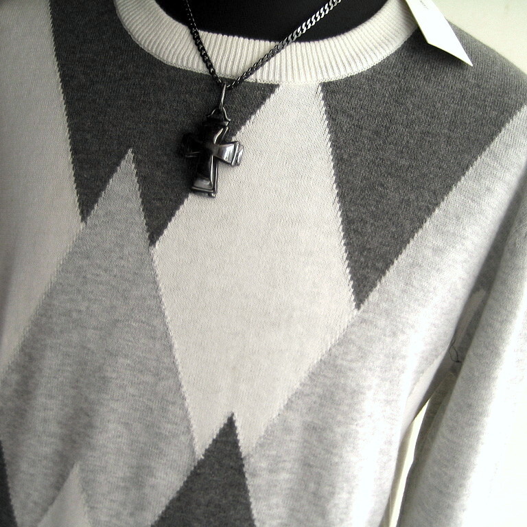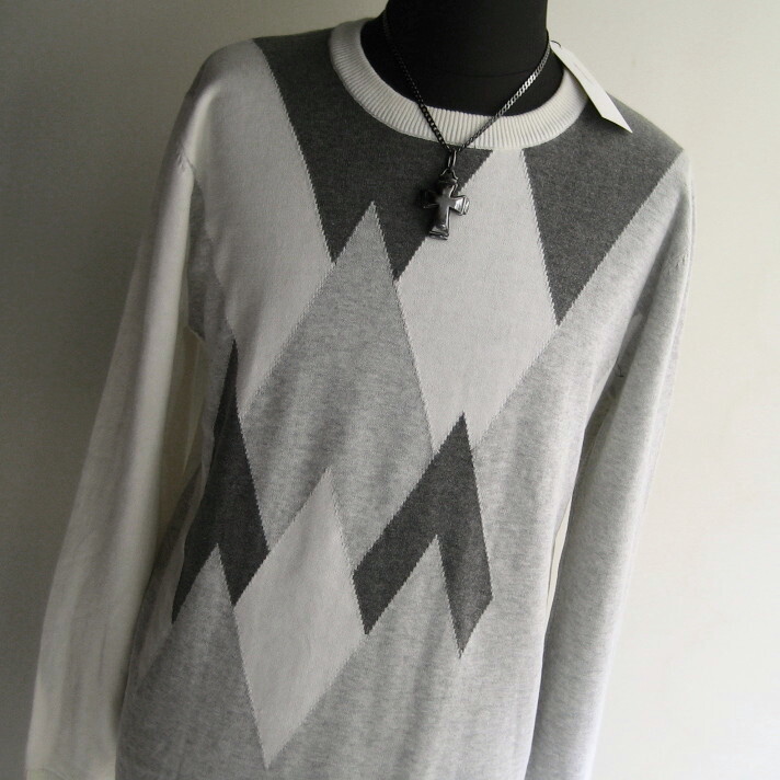 1.6万 新品 L ハイストリート アーガイル柄クルーネックニット ホワイト×グレー サンプル 577