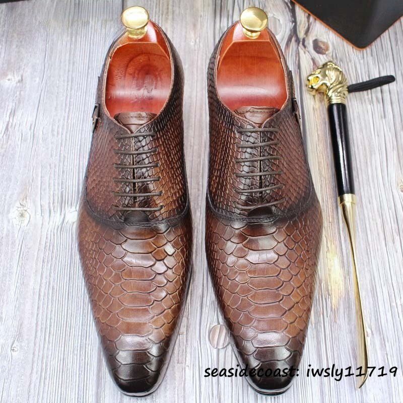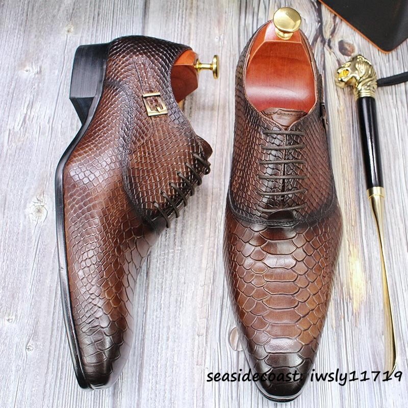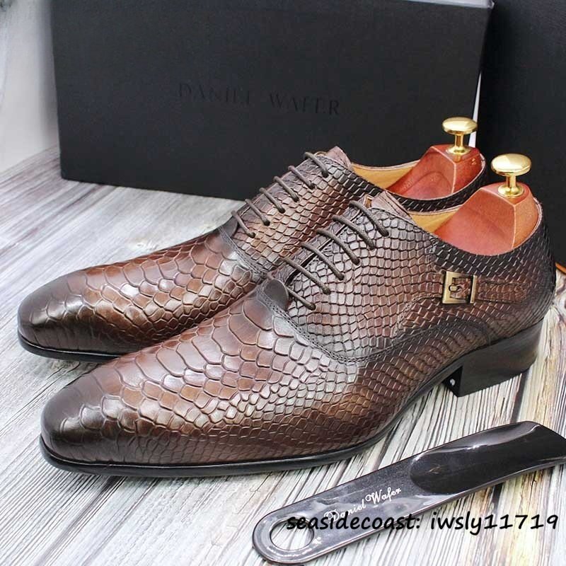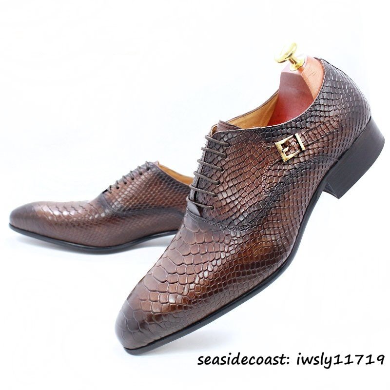 最高級★ビジネスシューズ 本革 蛇柄 レザーシューズ メンズ 職人手作り 紳士靴 モンクストラップ 革靴 牛革 宴会 結婚式 珈琲色 26.5cm