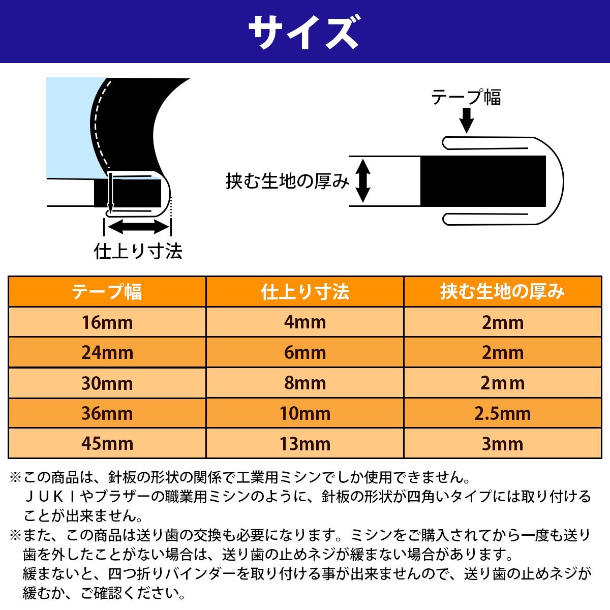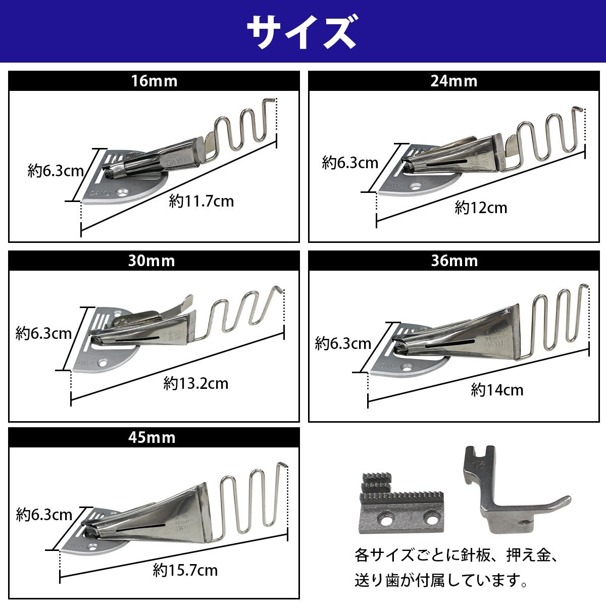 工業ミシン 四つ折り バインダー ミシン おさえ 16mm 24m m30mm 36mm 45mm 5点 セット 押さえ 職業用 工場 裁縫 送り歯搭載