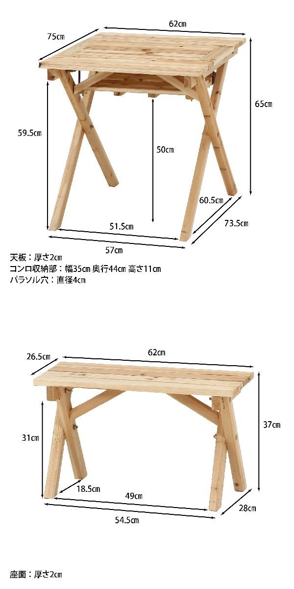| サイズ | 全体:幅620 × 奥行750 × 高さ650mm 座面高:370mm テーブルサイズ/重量:620x750x650mm/7kg ベンチサイズ/重量:620x280x370mm/2.5kg コンロスペース内寸:350x440x110mm ※詳細はサイズ画像をご確認ください。 |