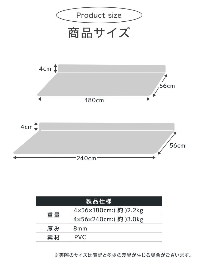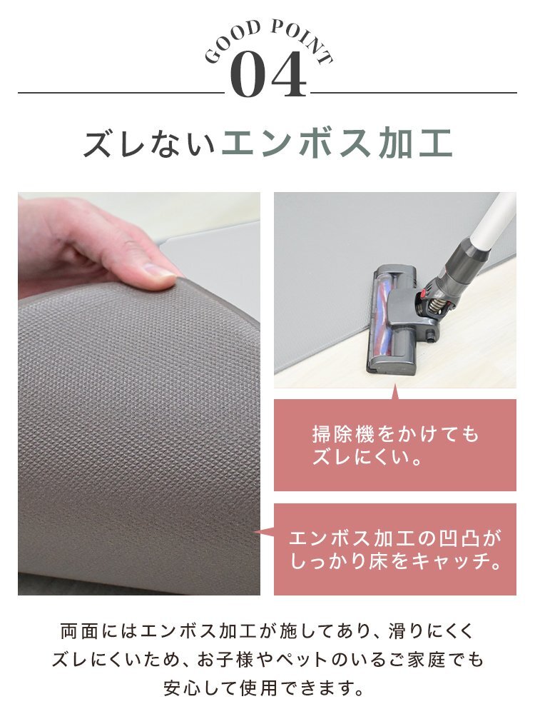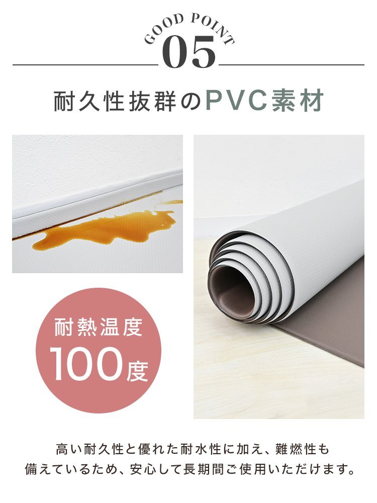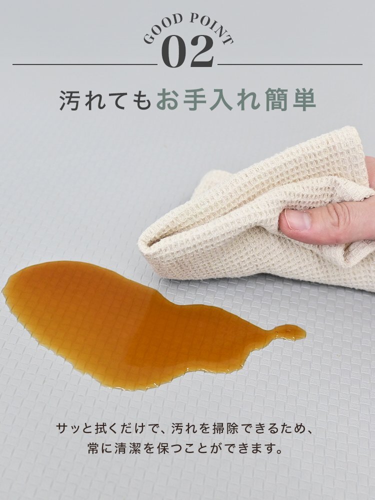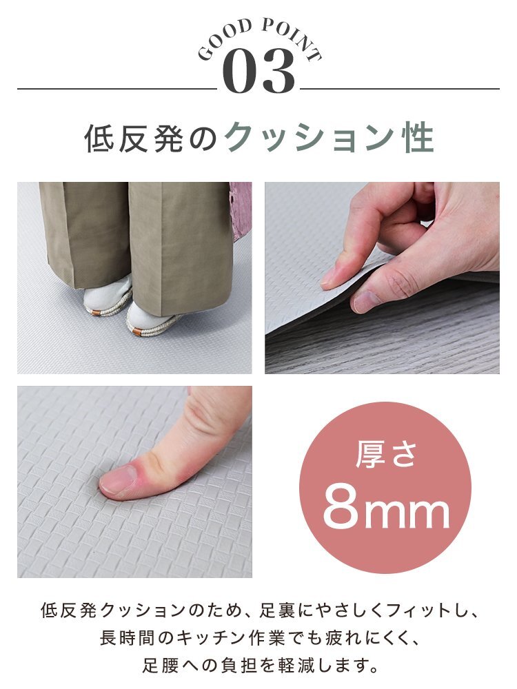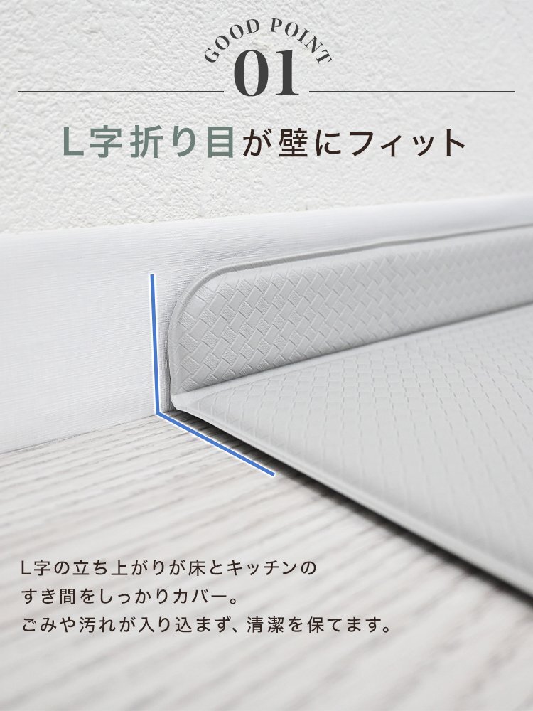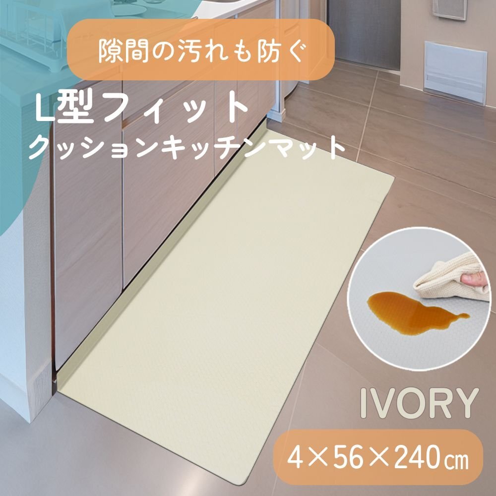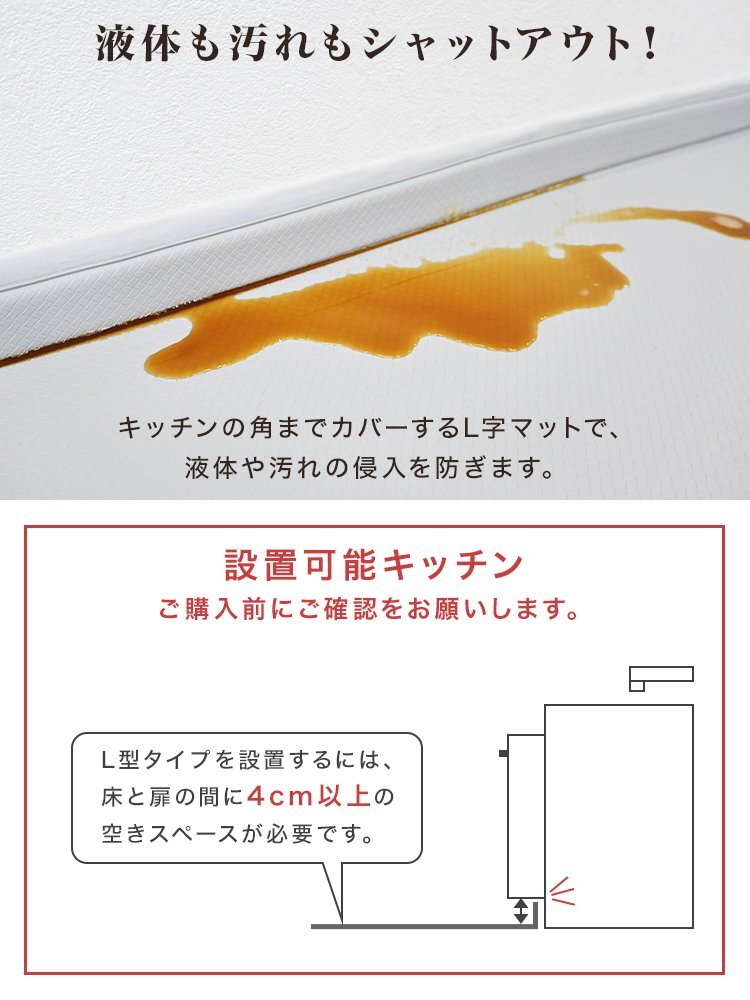 でも、汚れたマットをこまめに洗うのはめんどくさい…。 マットが滑りやすくて掃除機をかけるときにぐちゃっと丸まってしまう…。 そんなお悩みには、お洗濯不要!汚れやキズから床を守る、クッションキッチンマットがオススメです。 ■汚れ・水シミから床を守る 撥水性のあるPVC素材を使用してるので、汚れやシミに強く、 食べ物や飲み物をこぼしてもサッと拭くだけ!お手入れも簡単です。 ■低反発のクッション性 長時間のキッチン作業でも疲れにくく、足腰への負担を軽減します! ■ピタッとズレない快適設計 裏面が床にピタッと密着してズレを防止。 ■L字の折り目がスキマをカバー キッチン台と床のすき間にぴったりフィットするL字型の立ち上がりが、 床とキッチンの隙間に入り込むゴミや液体をシャットアウト! お掃除の手間もぐんと減ります。 【商品仕様】 カラー:アイボリー サイズ:(約)56×240×4cm 厚み:(約)8mm 素材:PVC 【注意事項】 ・伸縮性のある素材のため、サイズに多少の誤差が生じる場合があります。 ・商品は、モニターによって色合いが異なって見える場合があります。 ・仕様・デザインは改良のため予告なく変更することがあります。 |