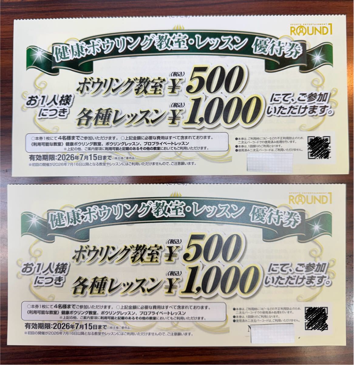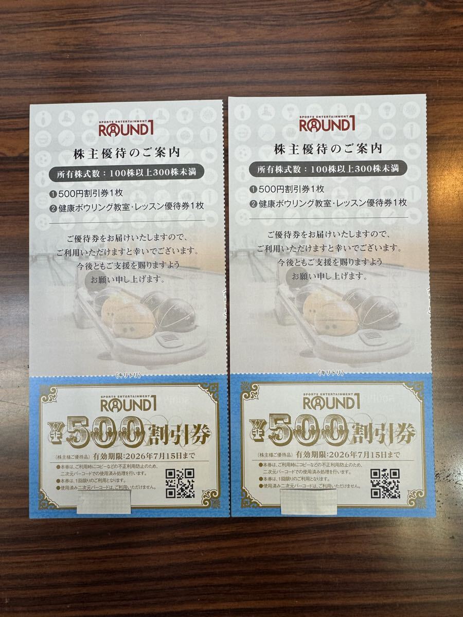 ラウンドワンの株主優待。500円割引券×2枚と、健康ボウリング教室レッスン優待券×2枚(1枚の紙の表裏に各券内容が記載されてます。)2026/7/15迄有効です。