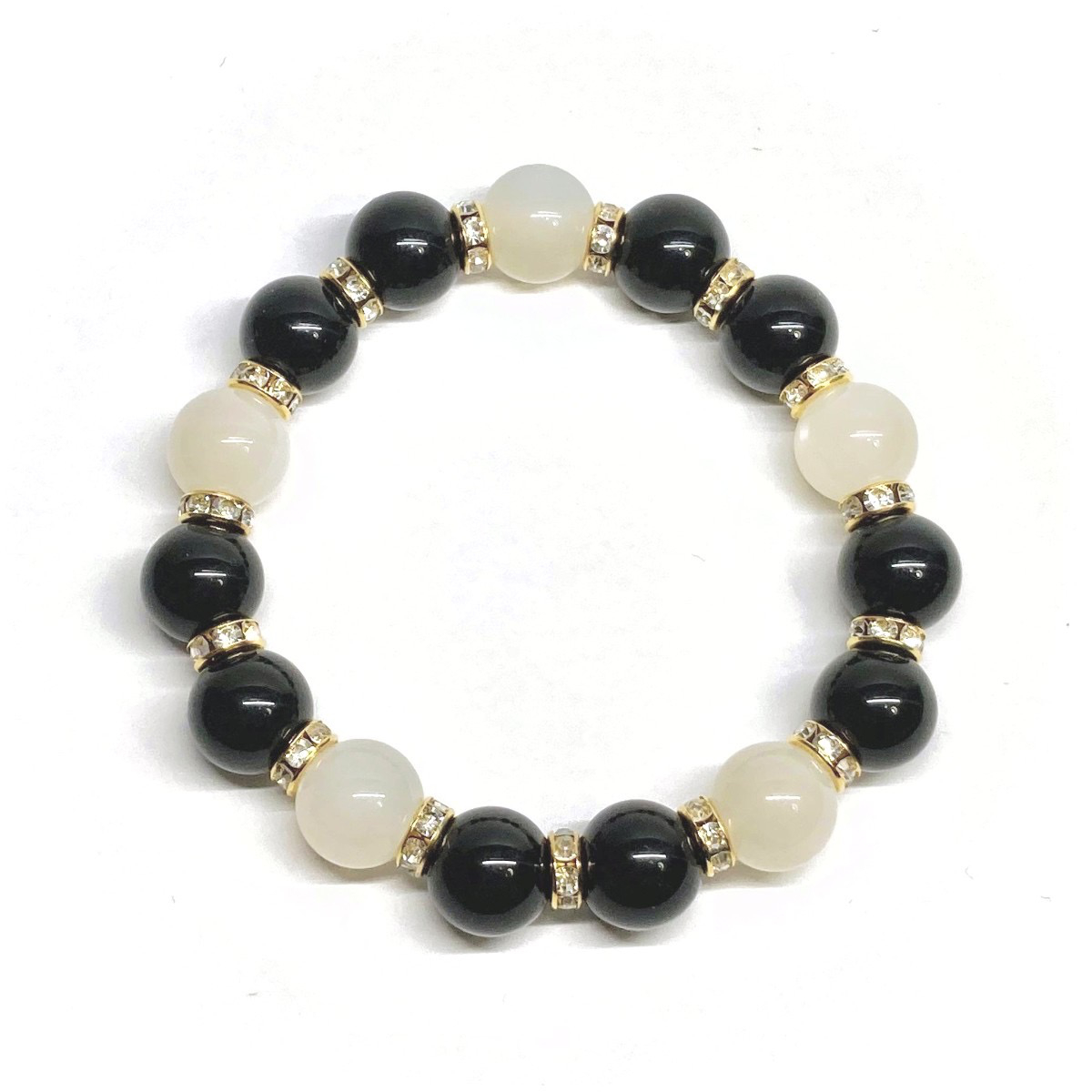 こちらは、モリオンとムーンストーンを組み合わせたパワーストーンブレスレットです。間にはロンデルを挟み高級感あるデザインに仕上げております。程よくインパクトがある12mm玉を使用して内周約18cmです。(サイズ変更の場合は取引ナビにてご連絡をお願いします。) 数に限りがございますので気になる方はお早めにどうぞ。