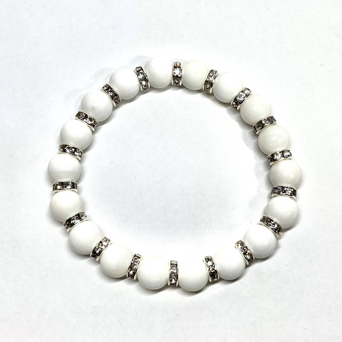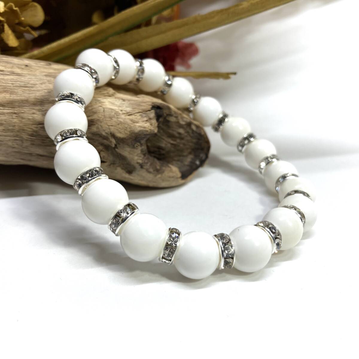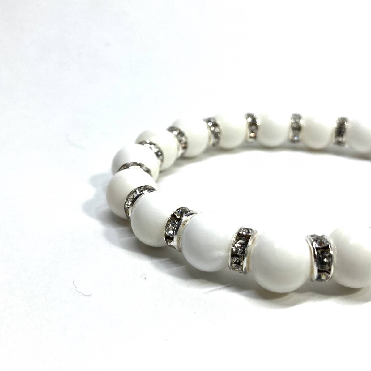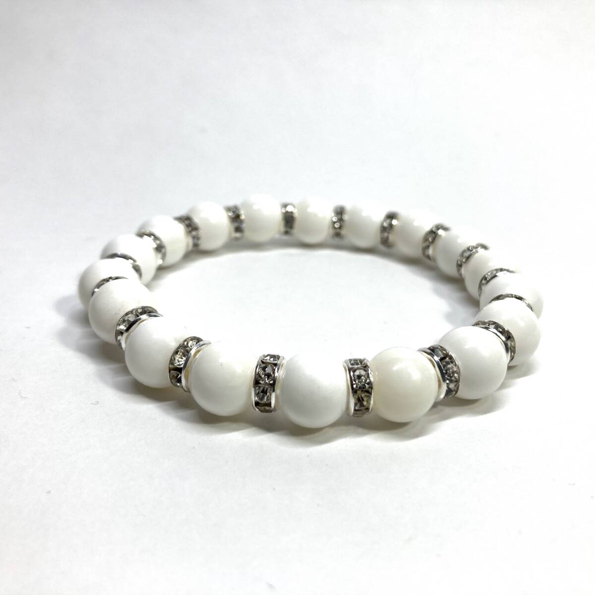 こちらは、10mm玉のホワイトオニキスを使用したパワーストーンブレスレットです。間にはロンデルを挟み高級感あるブレスレットに仕上げています。石大きさは腕にも馴染みやすいように10mm玉を使用して、サイズは内周約18cmです。(サイズ調節も無料で承っています。サイズ変更の場合は落札後、取引ナビにてご一報くださいませ。) 数に限りがございますので気になる方はお早めにどうぞ。