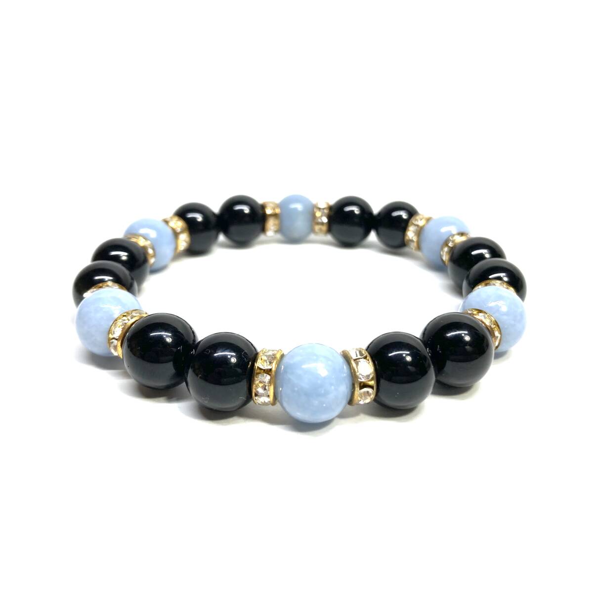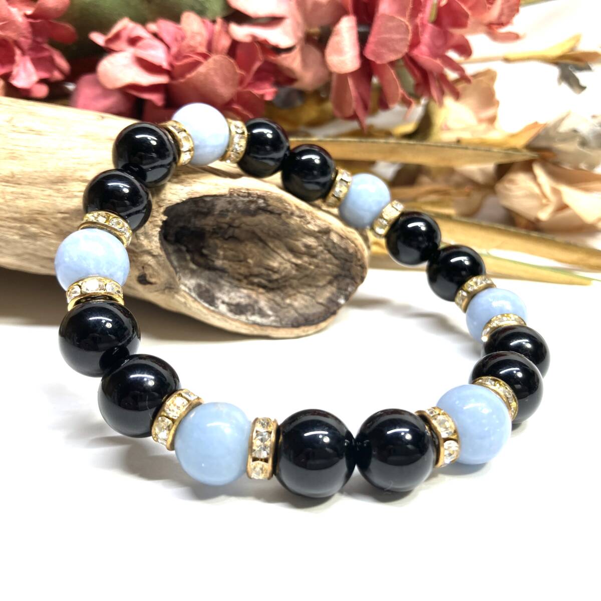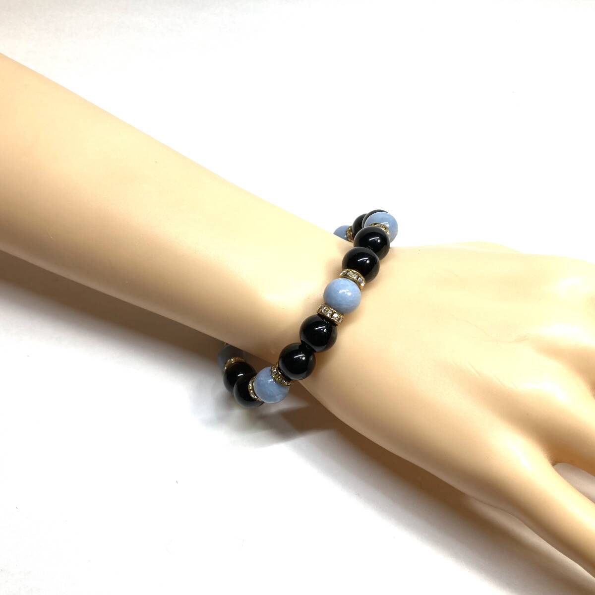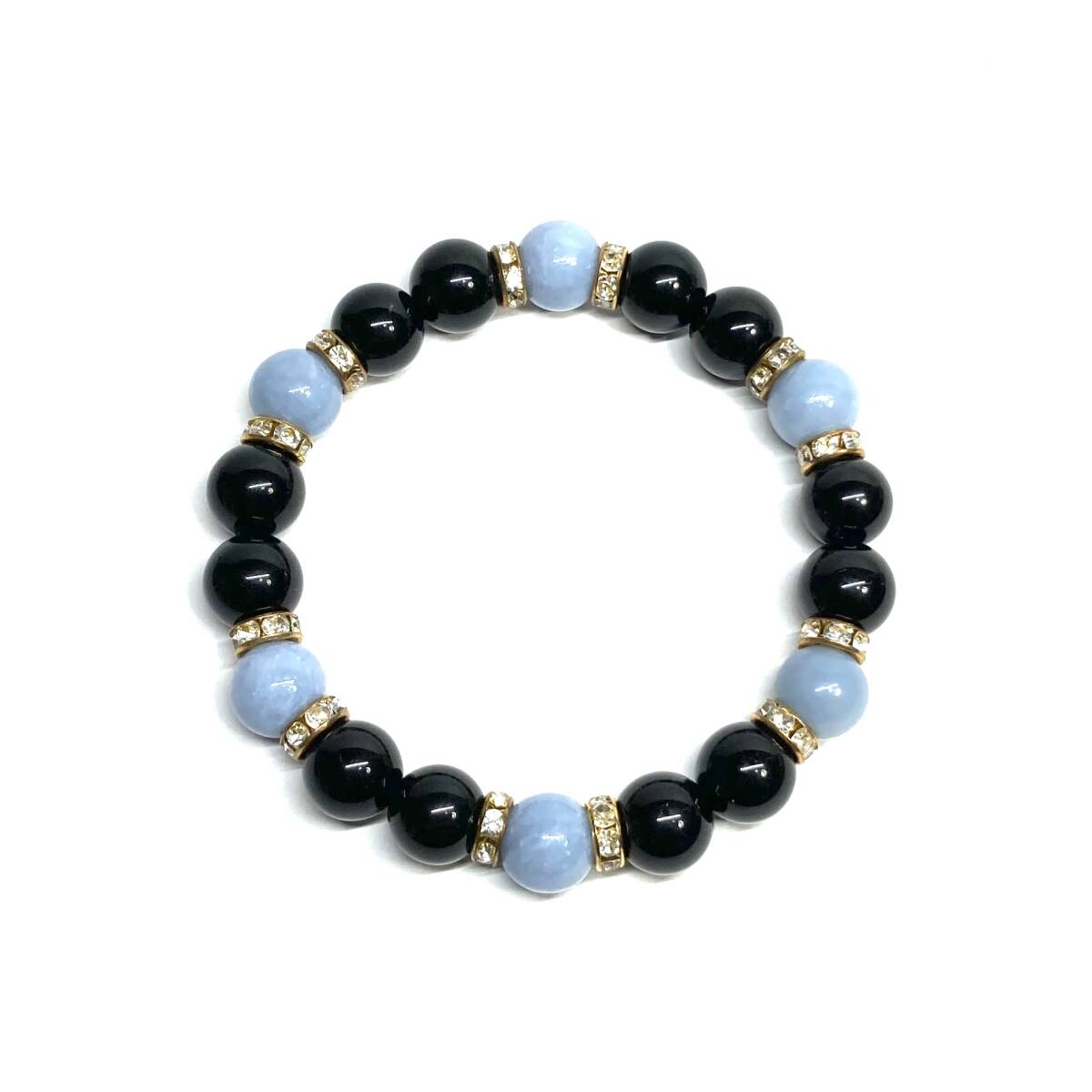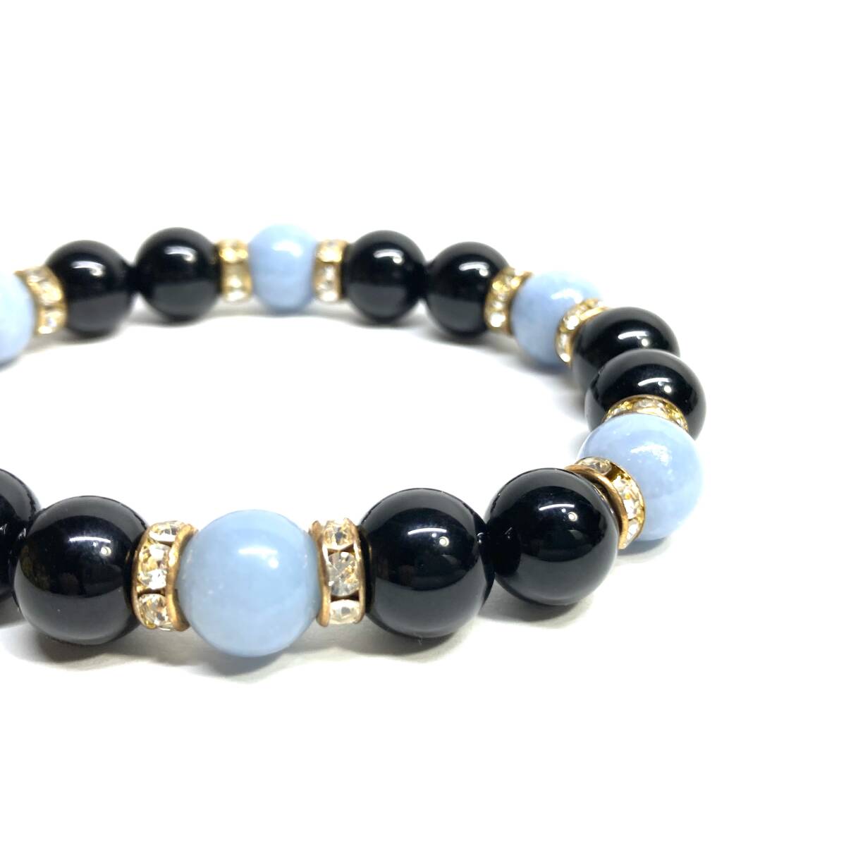 こちらは、モリオンとエンジェライトを組み合わせたパワーストーンブレスレットです。間にはロンデルを挟み高級感あるデザインに仕上げております。石大きさは腕にも馴染みやすいように10mm玉で内径約18cm(伸可能)です。(サイズ変更の場合は取引ナビにてご連絡をお願いします。) 数に限りがございますので気になる方はお早めにどうぞ。