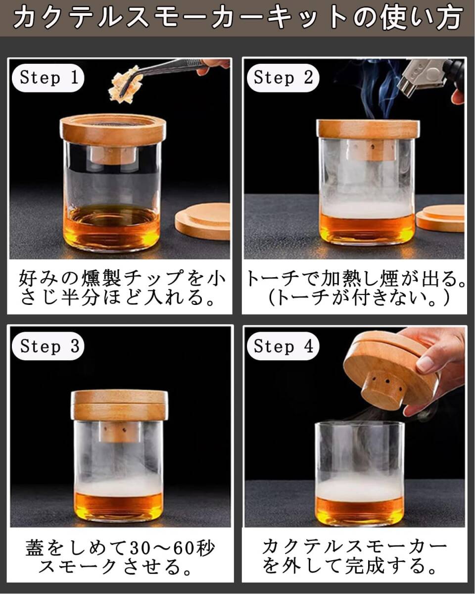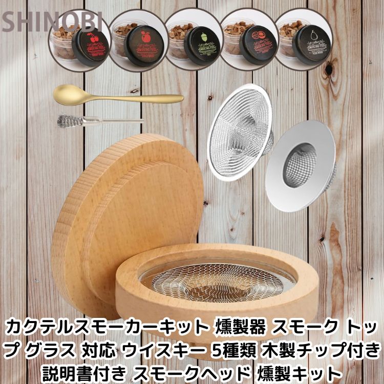 カクテルスモーカーキット 燻製器 スモーク トップ グラス 対応 ウイスキー 5種類 木製チップ付き 説明書付き スモークヘッド 燻製キット