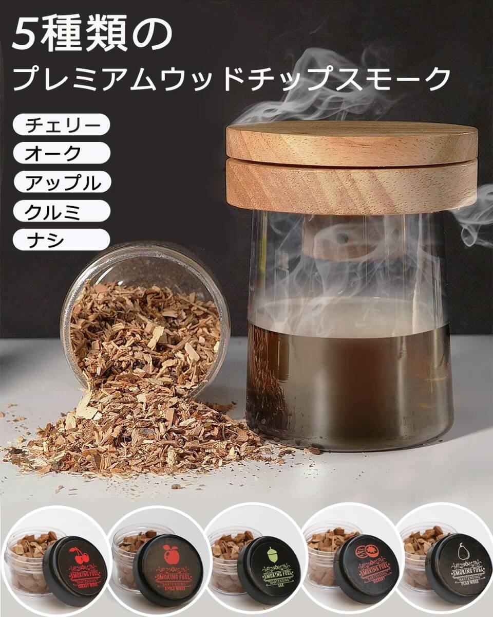アップル、チェリー、オーク、ナシ、クルミの5種類のウッドチップをセットにしており、それぞれ異なる香りと風味を楽しめます。
