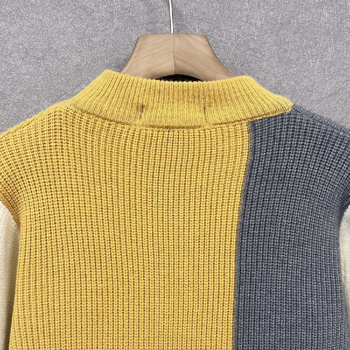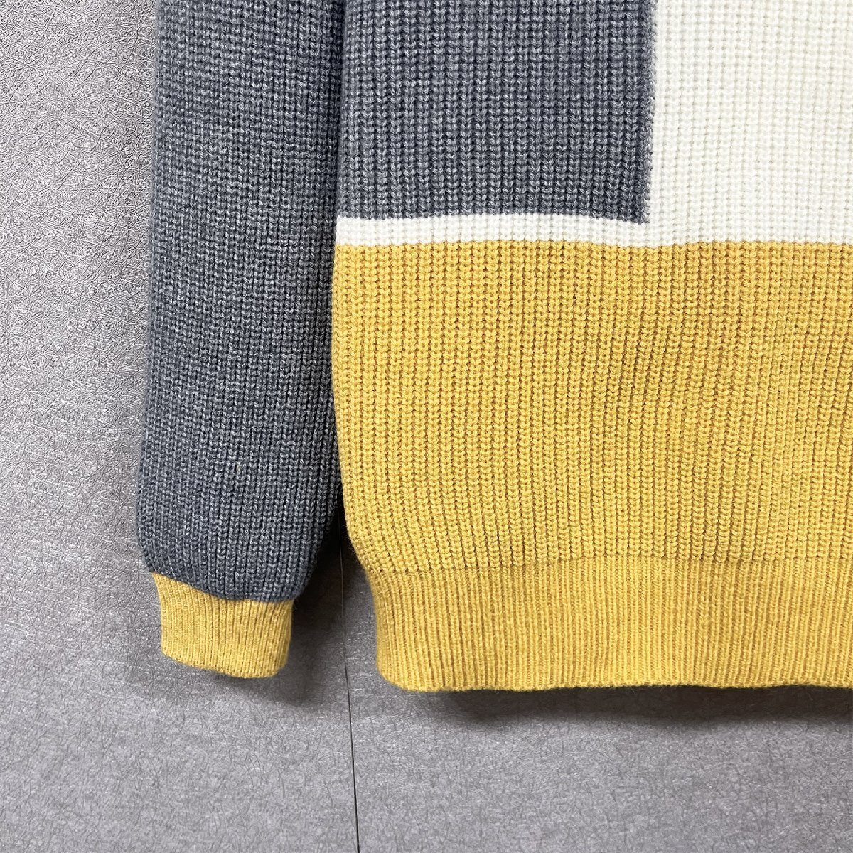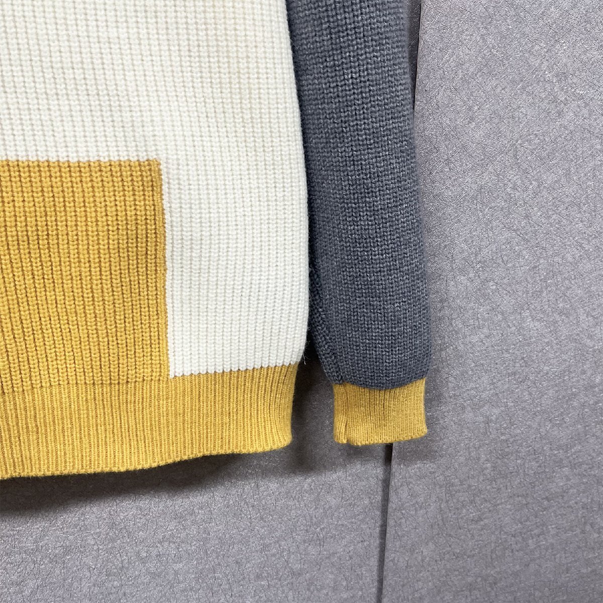 左右アシンメトリーな切り替えにしたカラーブロックニットプルオーバー。