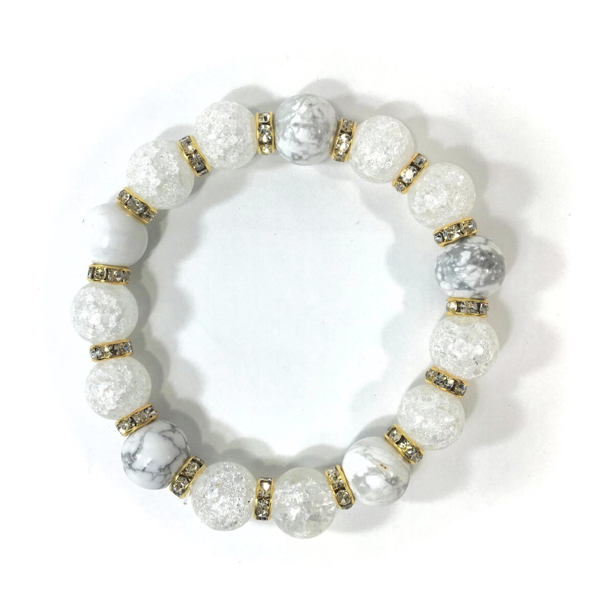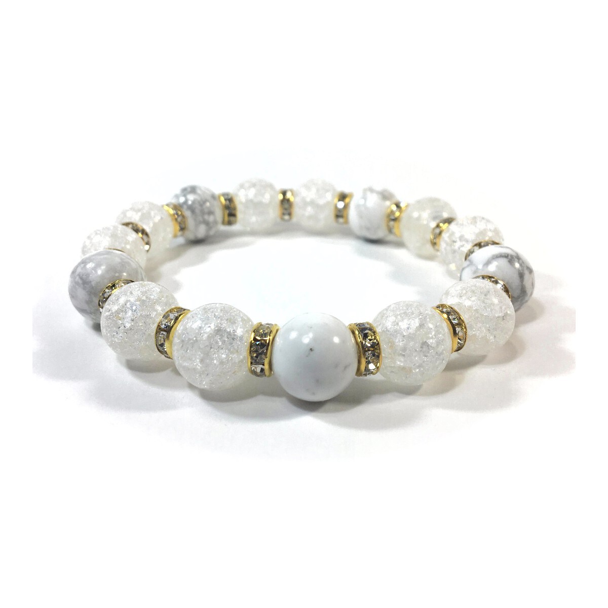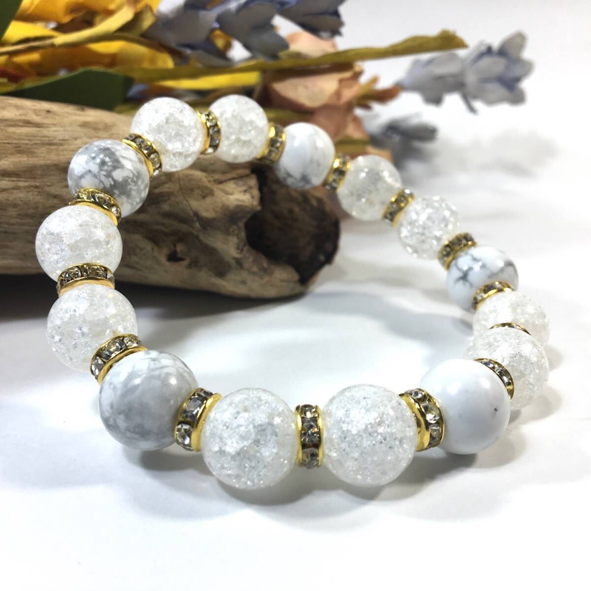 こちらは、クラック水晶とハウライトを組み合わせたパワーストーンブレスレットです。間にはロンデルを挟み高級感あるデザインに仕上げております。石大きさは12mm玉を使用して内径約18cmです。気になる方は是非この機会にどうぞ。