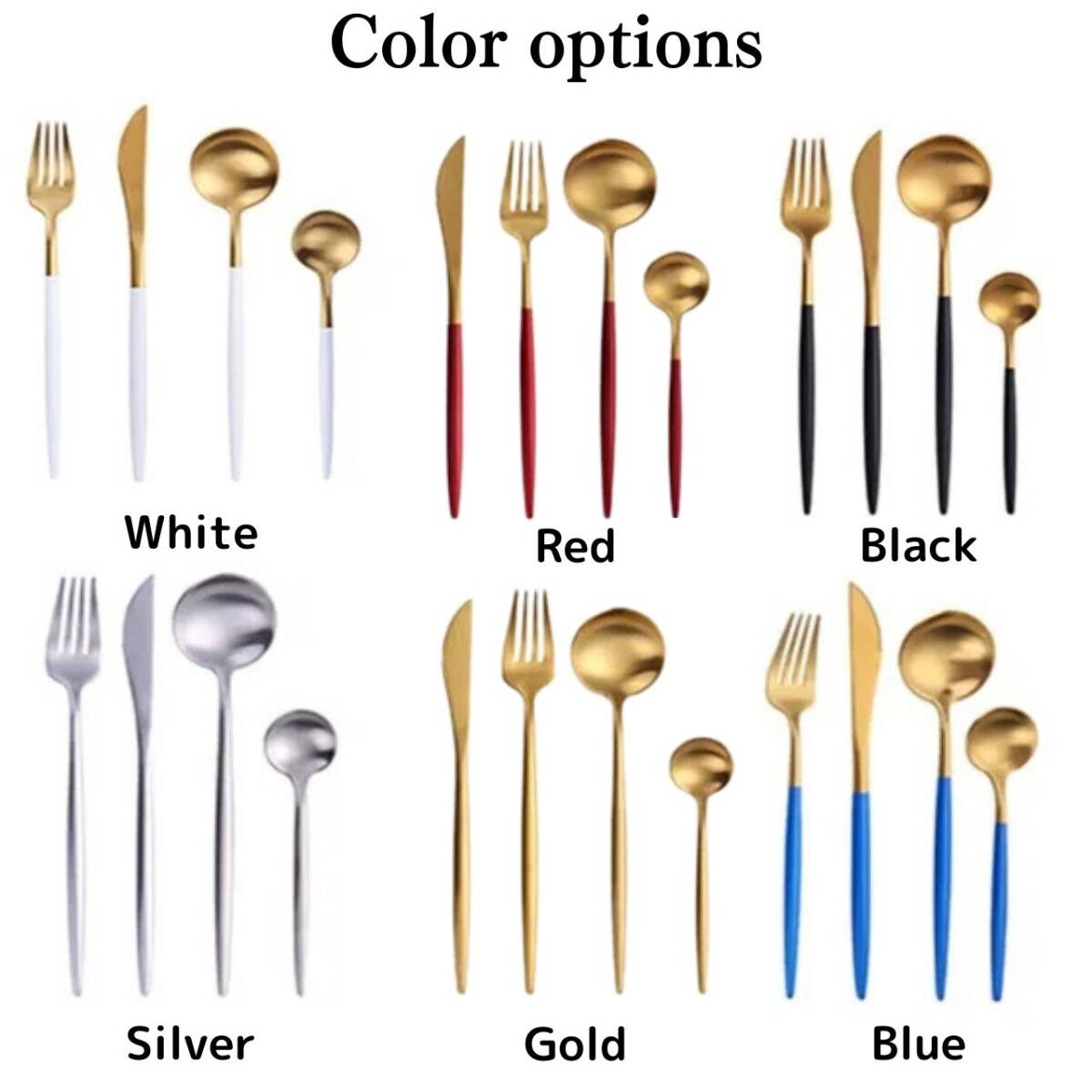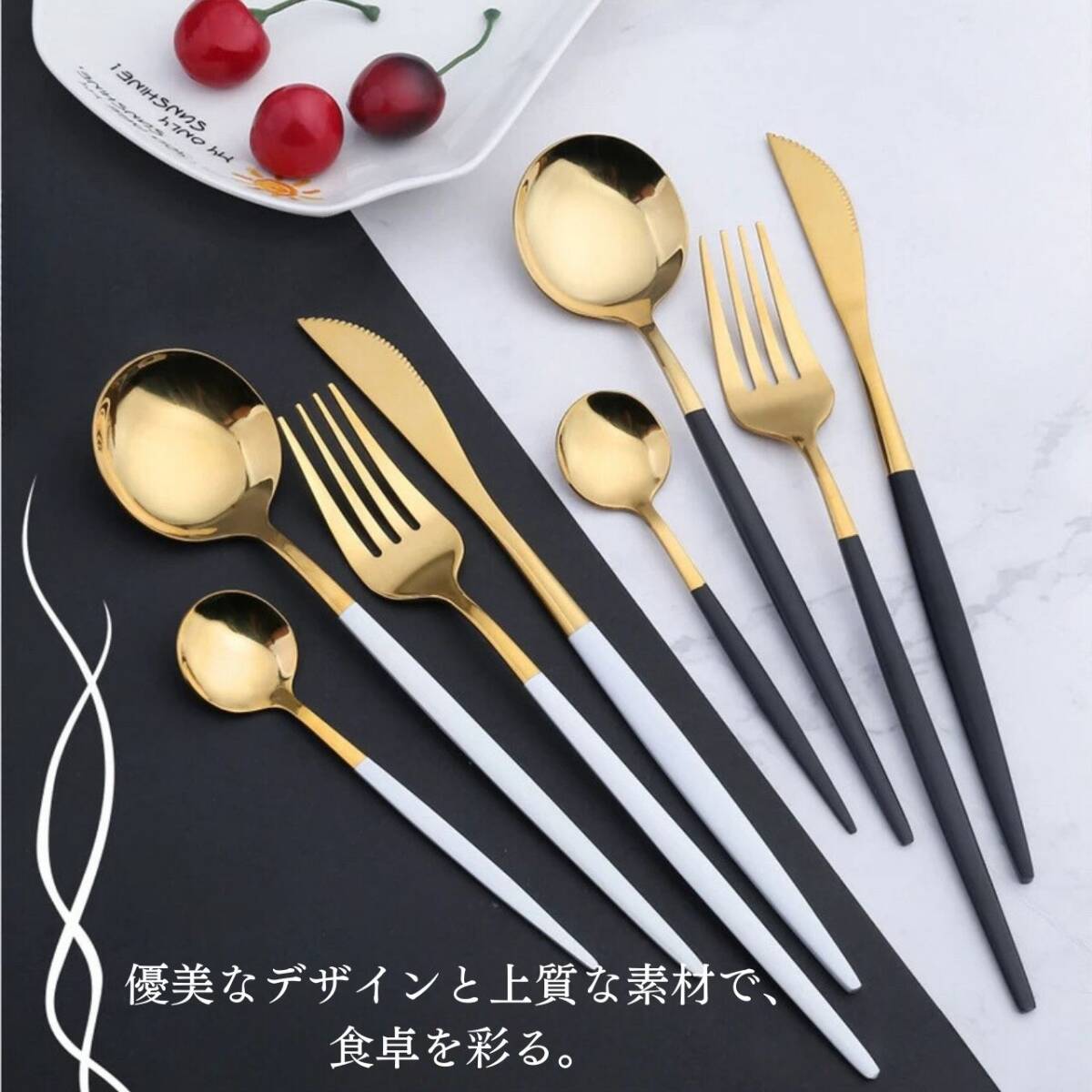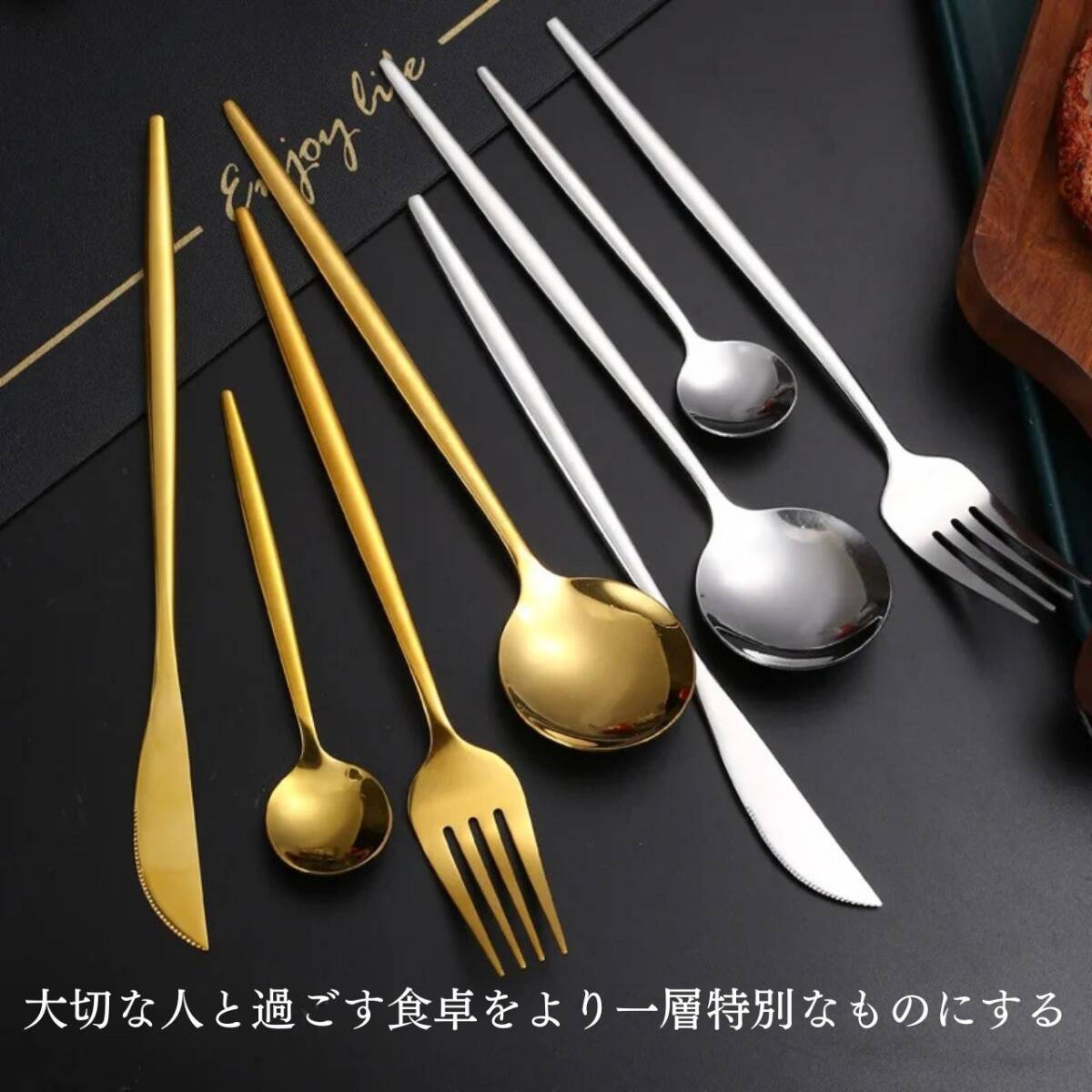 【お得!カトラリー8本セット】スプーン、ナイフ、フォーク、ティースプーンの4本セット×2【カラー】タイトル、商品画像1枚目をご確認ください。【食卓に彩りを】お好きなデザインを6種類から選べるカトラリー4本セット×2個自宅用にはもちろん、引越しや結婚祝いのギフトとしても人気のカトラリーセット。【日常使いに適したステンレス製】ステンレスは錆びにくさが特徴の素材です。光沢が美しく耐久性もあるので、日常使いに適しています。【商品詳細】材質:ステンレス製【セット内容】スプーン(幅4.5cm×長さ21cm 重さ37g)フォーク(幅2.7cm×長さ21cm 重さ30g)ナイフ(幅1.5cm×長さ22cm 重さ45g)ティースプーン(幅4cm×長さ18.5cm 重さ29g)【注意事項】・海外製品のため多少の傷や汚れ等ある場合がございます。・送料の都合上箱なし、簡易包装での発送となります。コメントなしでの即購入OKです。おまとめ買いでお値引きさせていただきます。お気軽にコメントください。gold silver gold×black gold×white gold×blue gold×redゴールド シルバー ブラック ホワイト ブルー レッド おしゃれ 可愛い食卓 キッチン 韓国 北欧 セット販売 お得 金 ゴン 黒 白 青 赤新居 引っ越し 食器 プレゼント 結婚祝い ギフト カップル カフェ"