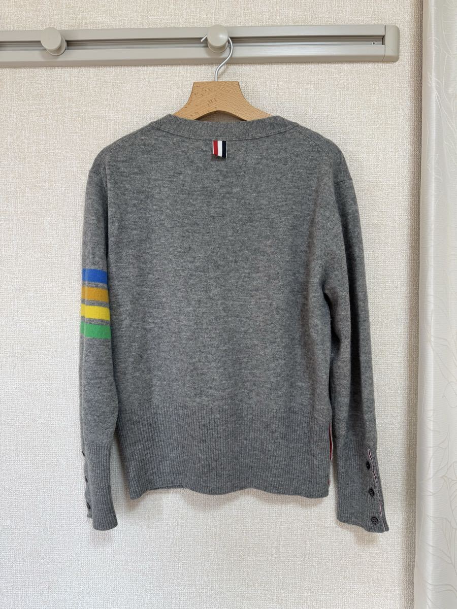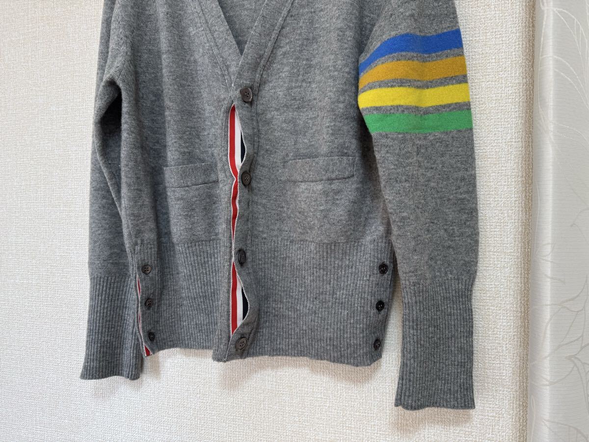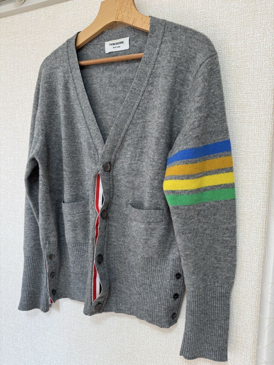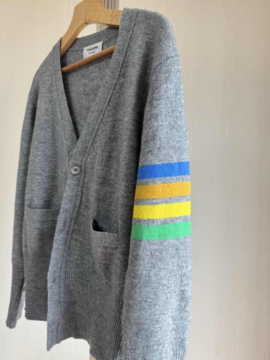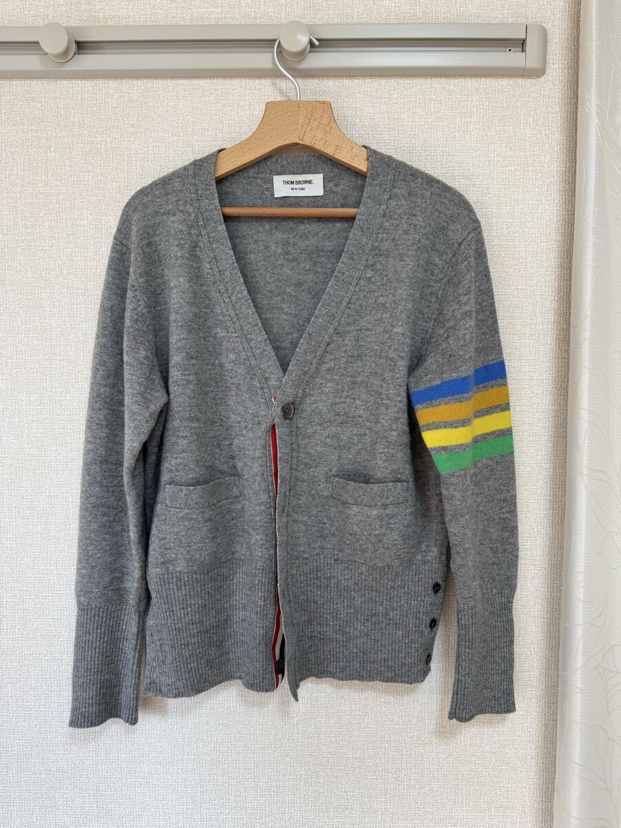 数年前にこちらのヤフオクにて50,000円程度で購入したトムブラウンのレインボーカーディガンです。GLAYの拝借に青オレンジ黄色緑の配色の良いデザインのカラーが入っております。確か2019年前後のアイテムだったと思います。