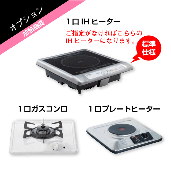 ※ オプションより『1口ガスコンロ』、『1口プレートヒーター』、『熱源なし』がご選択いただけます。