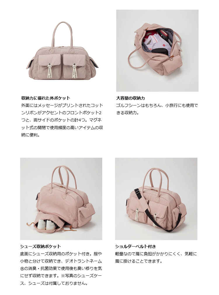 【商品特徴】 Boston Bag OV0722 商品詳細 オノフらしいやわらかな風合いを生かしたボストンバッグ。 ロゴリボンがアクセントになっており、トレンドを活かした アースカラーをテーマに女性らしいデザインに仕上げました。 機能面では、ナイロン素材を採用することで、生地強度を強く保ち、 また水や汚れに強い撥水加工を施しました。シューズ用ポケットや 小物を入れられる外ポケットなど使い勝手のいいボストンバッグです。 Boston Bag OV0722 価格 :15,950 円(税込) 素材 :ナイロン サイズ:49×25×28cm カラー:グリーンカーキ ・ショルダーベルト付 ・底面にシューズ収納ポケット[デオドラントネーム(消臭・除菌効果)付] ・小物をすぐに取り出せる4つの外ポケット made in China ※撮影時の光量の具合や、ご覧いただいております画面環境によりまして、実際の商品と若干色味が違う場合がございます。 ※使用している素材や生地の状態によっては、サイズ仕様(cm)に多少の差異が生じる場合がございます。