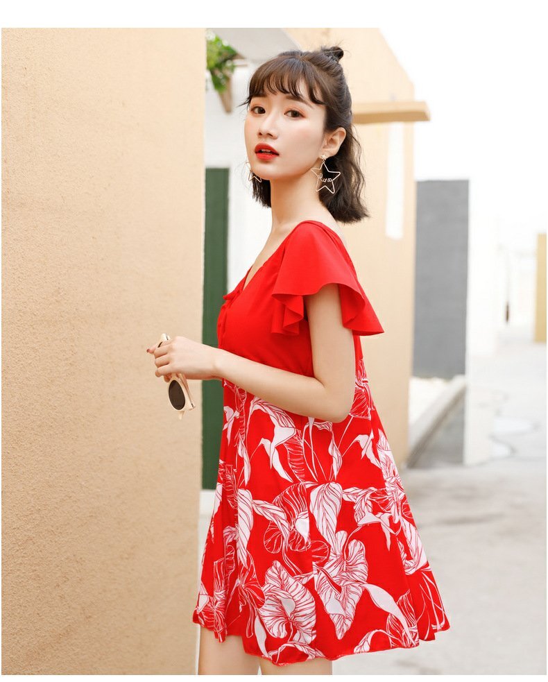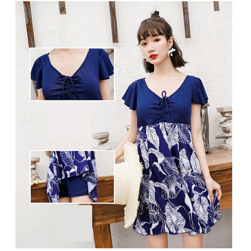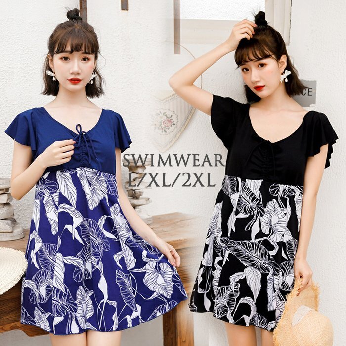 ・リーフ柄がお洒落なワンピース水着。フロントはシンプルなAラインシルエットです。