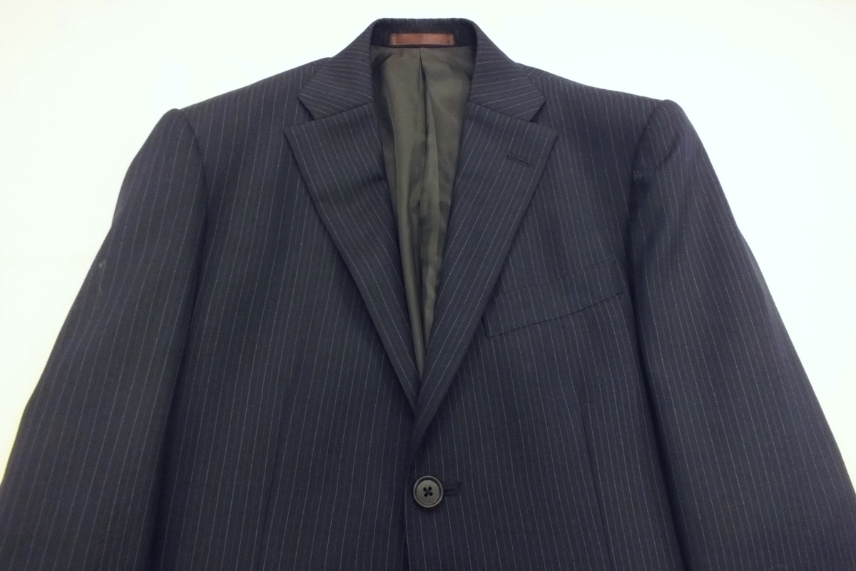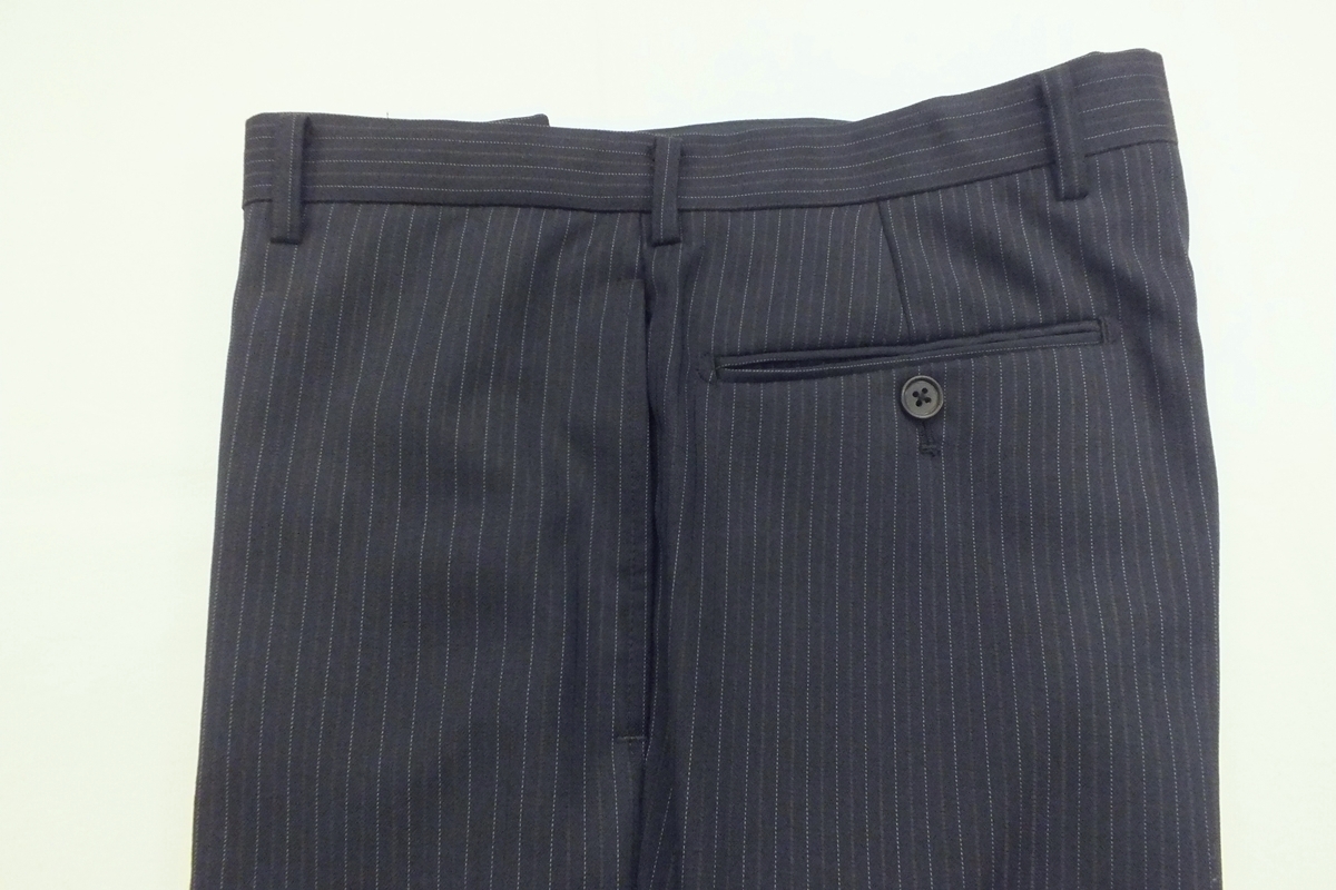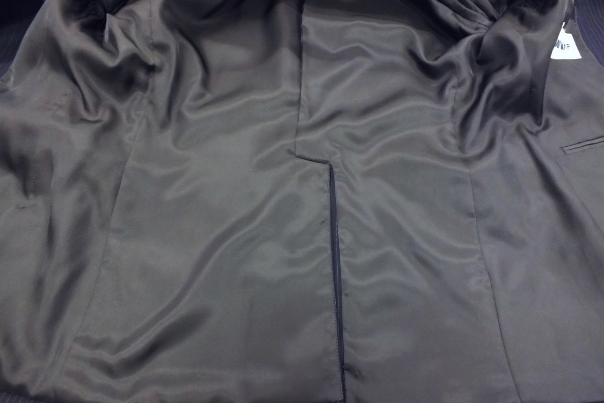 シーズン:秋冬春 サイズ:AB4(胸回94・腰回84・身長165) 上着デザイン:シングル2釦スリーピース 裏仕様:総裏仕立て スラックス:ノータッグ(膝当て付き) 色柄:チャコールグレー系縞 表素材:ウール70/ポリエステル30% 胴裏:ポリエステル100% 袖裏:ポリエステル100% 縫製:MADE IN CHINA 詳細な寸法 上着:着丈69・肩幅46.9・袖丈57・身幅52・胴廻り92 スラックス:腰廻り84・股上26.5・渡り巾33.5・膝幅23.8・裾巾20 上記記載の数字は何れもcmになります。 【補正希望の方】裾上げ800円になりますので落札した後ご連絡ください。 | ||||