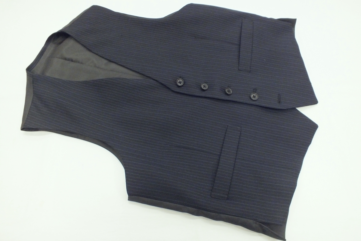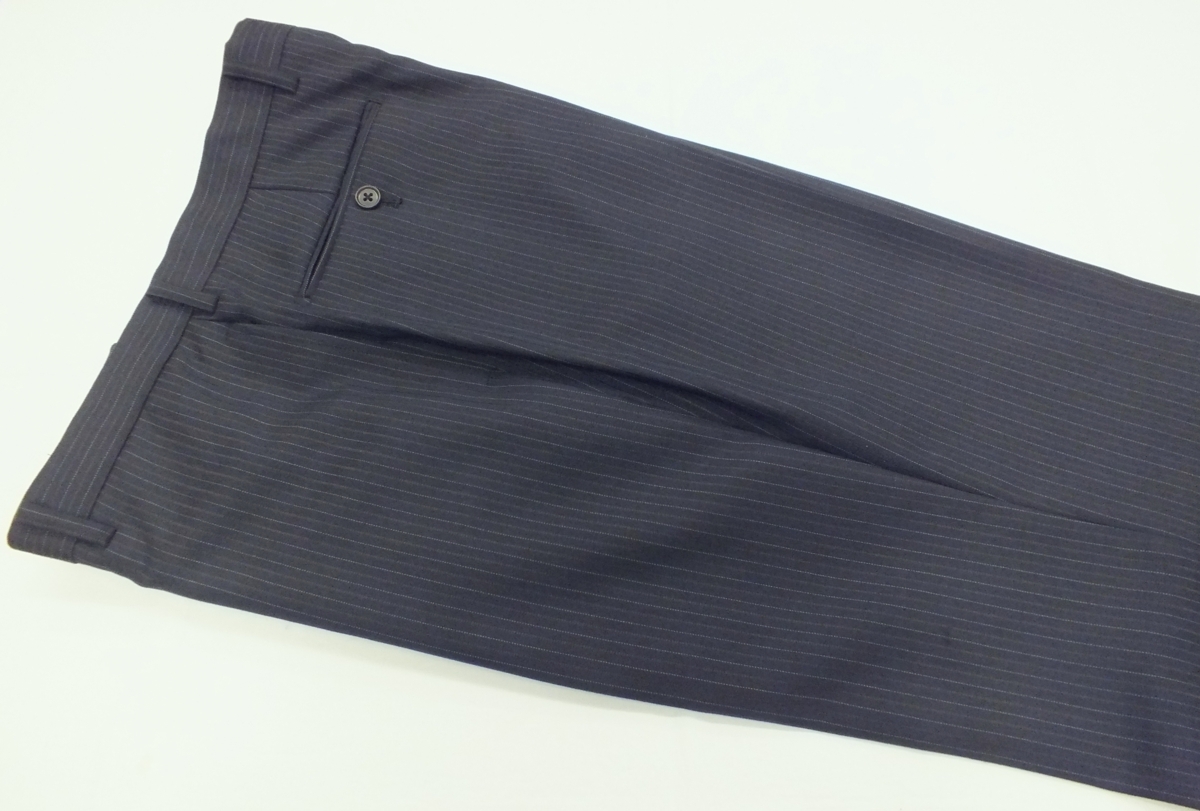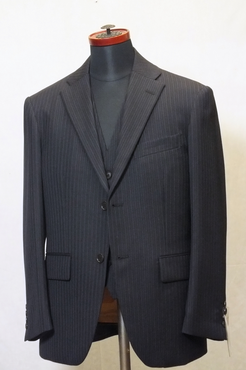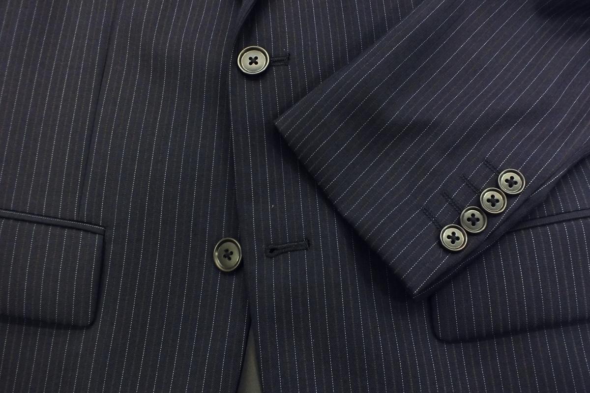 シーズン:秋冬春 サイズ:AB4(胸回94・腰回84・身長165) 上着デザイン:シングル2釦スリーピース 裏仕様:総裏仕立て スラックス:ノータッグ(膝当て付き) 色柄:チャコールグレー系縞 表素材:ウール70/ポリエステル30% 胴裏:ポリエステル100% 袖裏:ポリエステル100% 縫製:MADE IN CHINA 詳細な寸法 上着:着丈69・肩幅46.9・袖丈57・身幅52・胴廻り92 スラックス:腰廻り84・股上26.5・渡り巾33.5・膝幅23.8・裾巾20 上記記載の数字は何れもcmになります。 【補正希望の方】裾上げ800円になりますので落札した後ご連絡ください。 | ||||