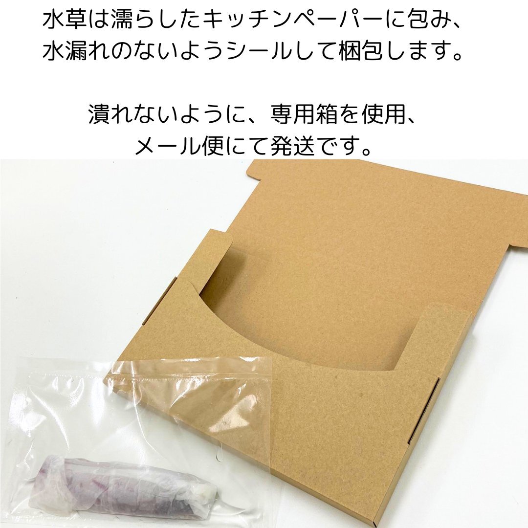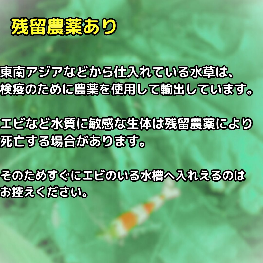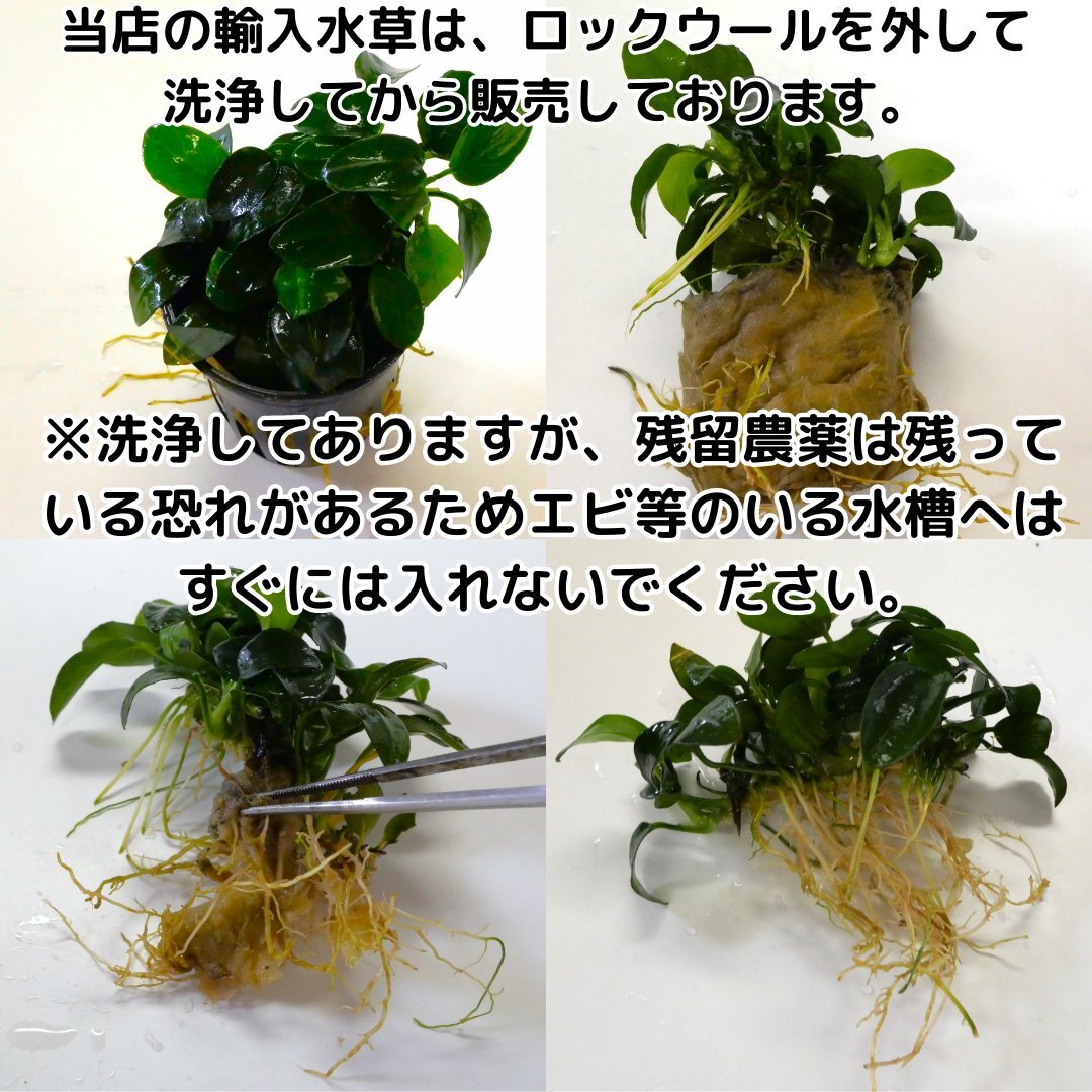 陰性水草の仲間なので、強い光量を必要としないため手軽に始められます。※古い葉は新しい環境に適応できない場合には枯れたりコケに覆われたりします。古い葉や根はカットすることをお勧めします。また、活着させる場合も、すでに生えている根には活着する力ないので、古い根をカットしてから巻き付けます。そうすることで、活着に適した新たな根を伸ばしてくれます。輸送に伴う傷がある場合があります。洗浄はしてありますが、エビ等水質に敏感な生体がいる水槽への導入は、お客様の自己責任にてお願いします。
