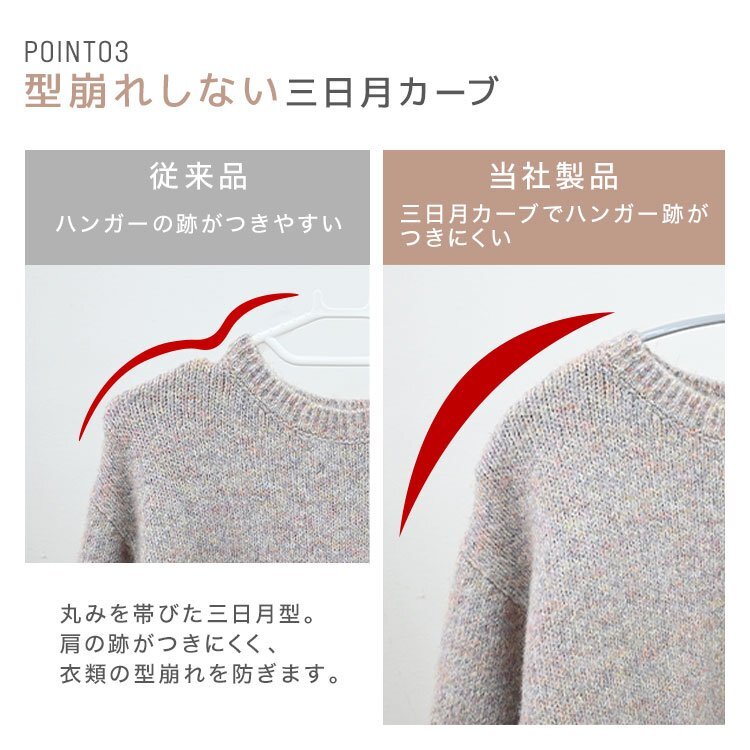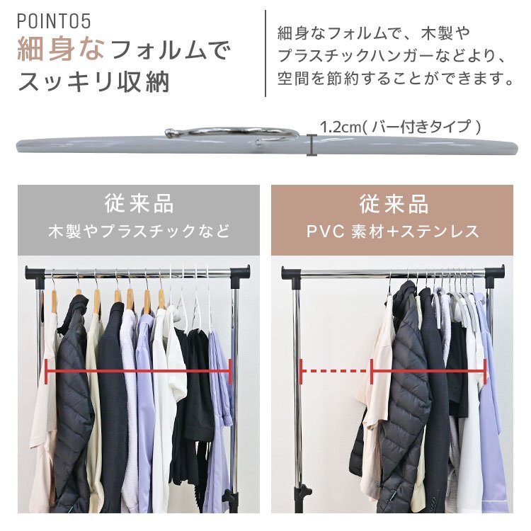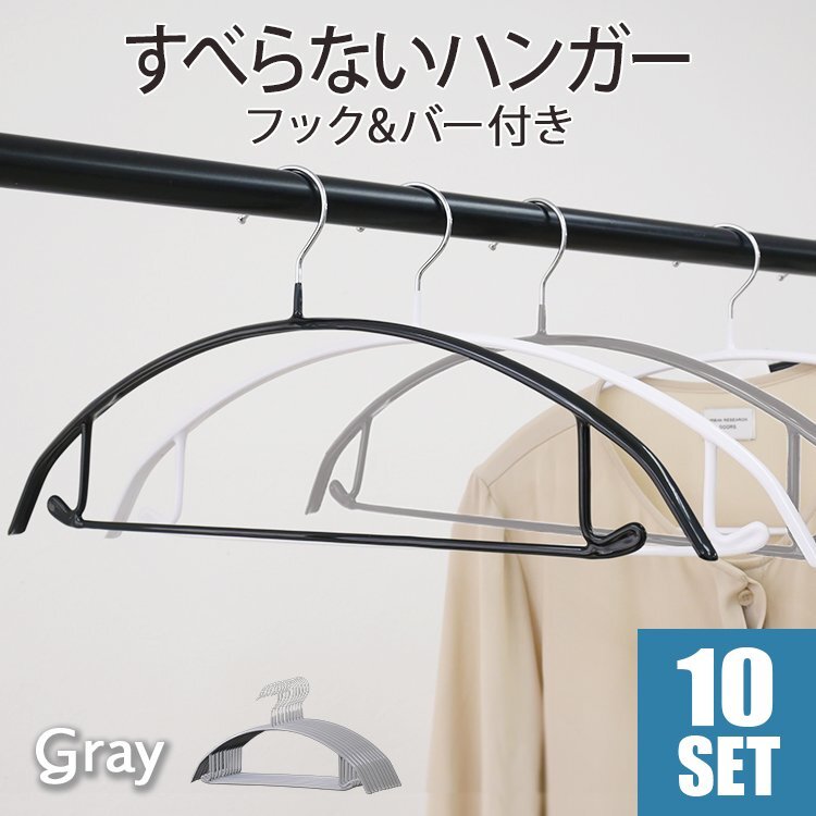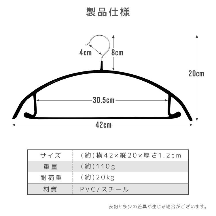 滑らない、型崩れしない! おしゃれで便利な すべらないハンガー です。 下着やキャミソールなどを掛けられるフック、パンツやタオルなどが掛けられるバーを追加し、さらに便利に! セットアップやストールなど、まとめてスッキリ収納できます。 ■滑り止め加工 表面に特殊なPVCコーティング加工を施しているので、滑りにくい構造となっており、衣類をしっかりキャッチします。 襟の開いたブラウスやキャミソール等、滑りやすい素材の洋服にもオススメ! ■型崩れ防止 丸みのある三日月型カーブで、ハンガーの跡がつきにくく、型崩れを防止しキレイな状態でお洋服をキープしてくれます。 跡のつきやすい柔らかいニットにもオススメ! \優れた利便性/ ■固定式で絡まないフック ■スリムなデザインでスッキリ収納! ■丈夫なスチール製で重さ、サビに強い! ■ノーマル・バー付きタイプは耐荷重20kgで、重たい衣類も安心!ジャケットやコート類もしっかり固定! ■乾湿両用としてクローゼット収納・洗濯時にも使用可能。 【商品詳細】 内容:ハンガー10本 タイプ:バー付きタイプ カラー:グレー サイズ:(約)横42×縦20×厚さ1.2cm 重量:(約)110g(1本あたり) 耐荷重:(約)20kg 素材:PVC、スチール 【注意事項】 ・PVC加工は大変柔らかな素材となっております。 そのため、製造工程や輸送中に若干の凹みや歪みが生じる場合がございます。 ご使用上には問題がありませんので、予めご了承ください。 ・商品は、モニターによって色合いが異なって見える場合があります。 ・仕様・デザインは改良のため予告なく変更することがあります。 |