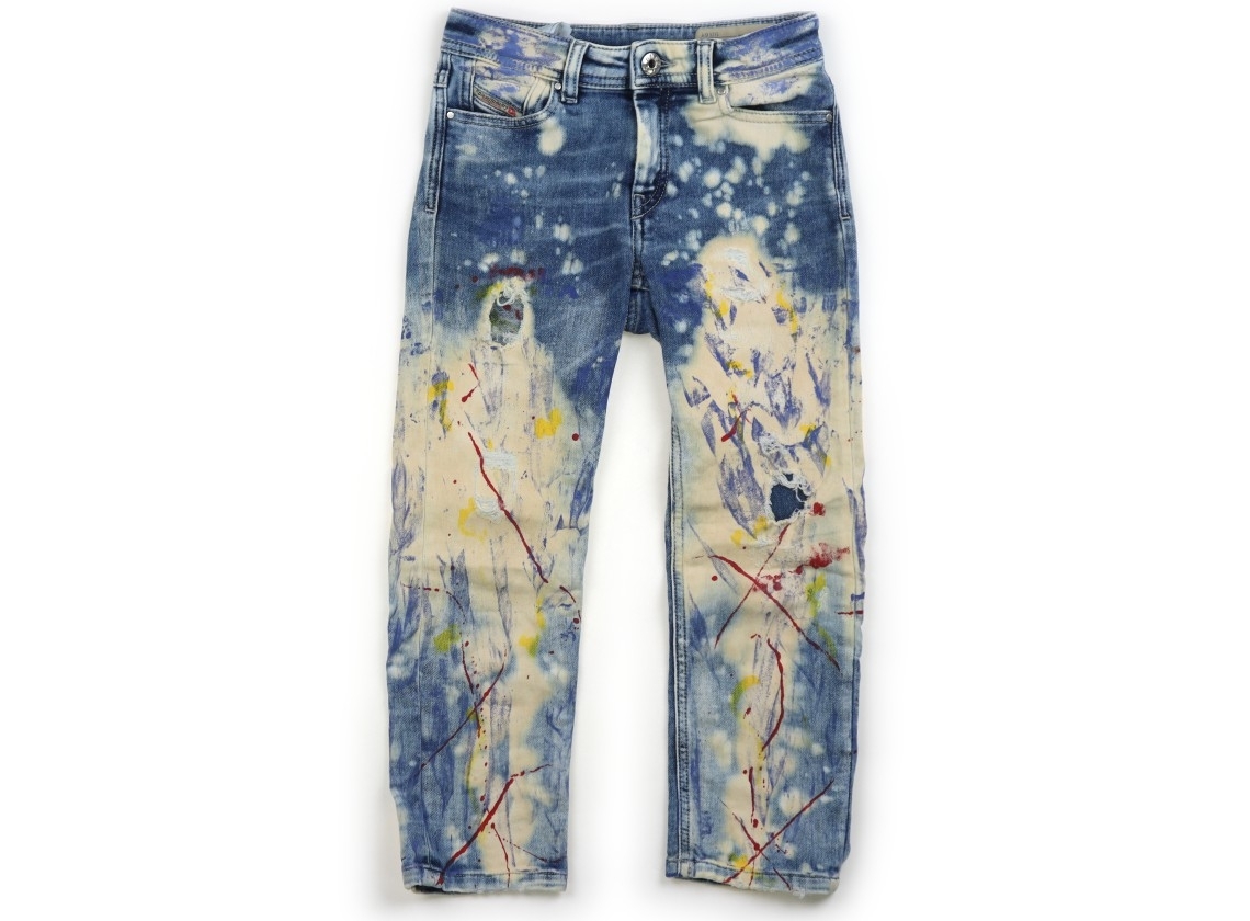 実際のサイズ表記は6Y。綿・ポリエステル・ポリウレタンのストレッチデニム。ウエストはサイズ調整ゴムが付いています。前ファスナー開き。ダメージ加工と、落書き加工がありますが、それ以外のシミも所々に多数見られます。後身頃のウエスト下に元々あったと思われるダメージ加工がやや広がったような擦り切れがあります。まだまだお使いいただけます。