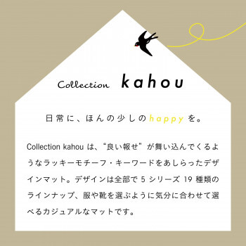 Collection kahou は、「良い報せ」が舞い込んでくるようなラッキーモチーフ・キーワードをあしらったデザインマット。服や靴を選ぶように気分に合わせて選べるカジュアルなマットです。表面のパイルは吸水性に優れているので、キッチンや水回りでの使用にも最適。ほどよいサイズ感で、どんな場所でも使いやすいインテリアマットです。