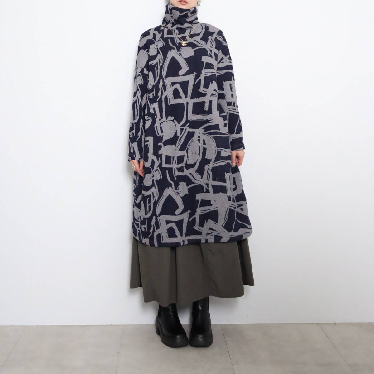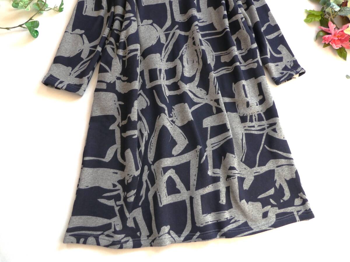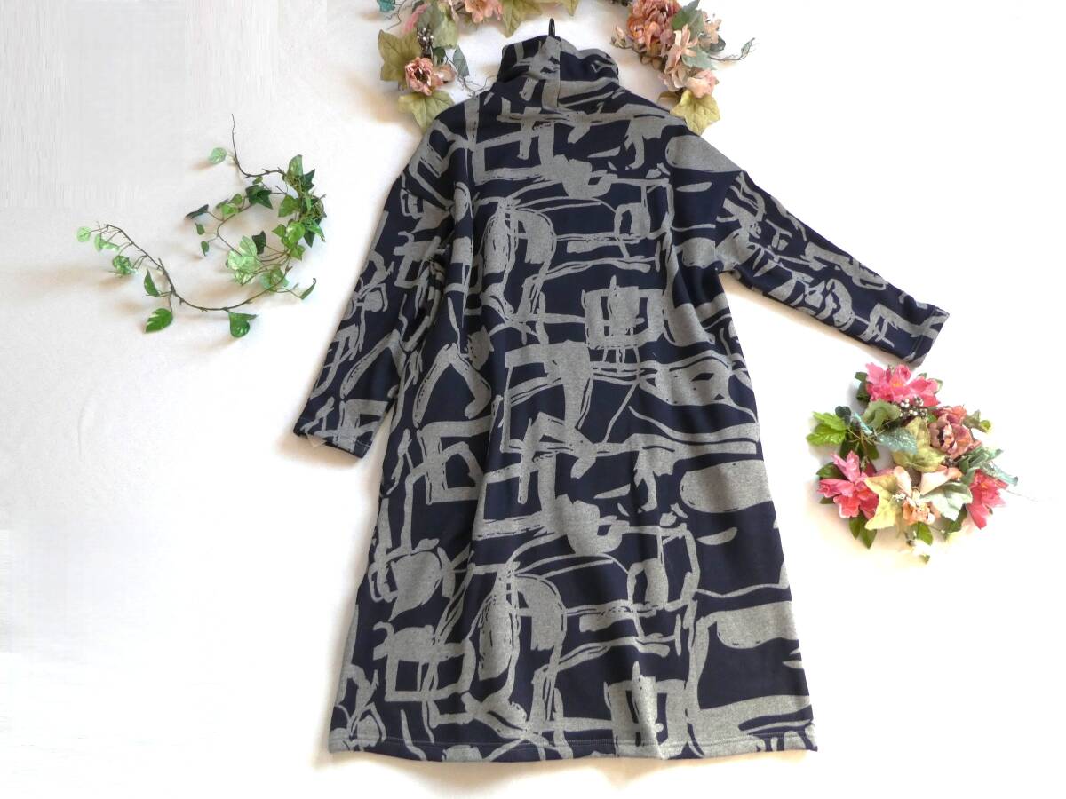 ゆったりサイズ【新品】裏起毛ニットソー素材♪ラインアートmodeプリント◇オフタートルチュニック・ワンピ・ネイビー×グレー◆fit1027◆