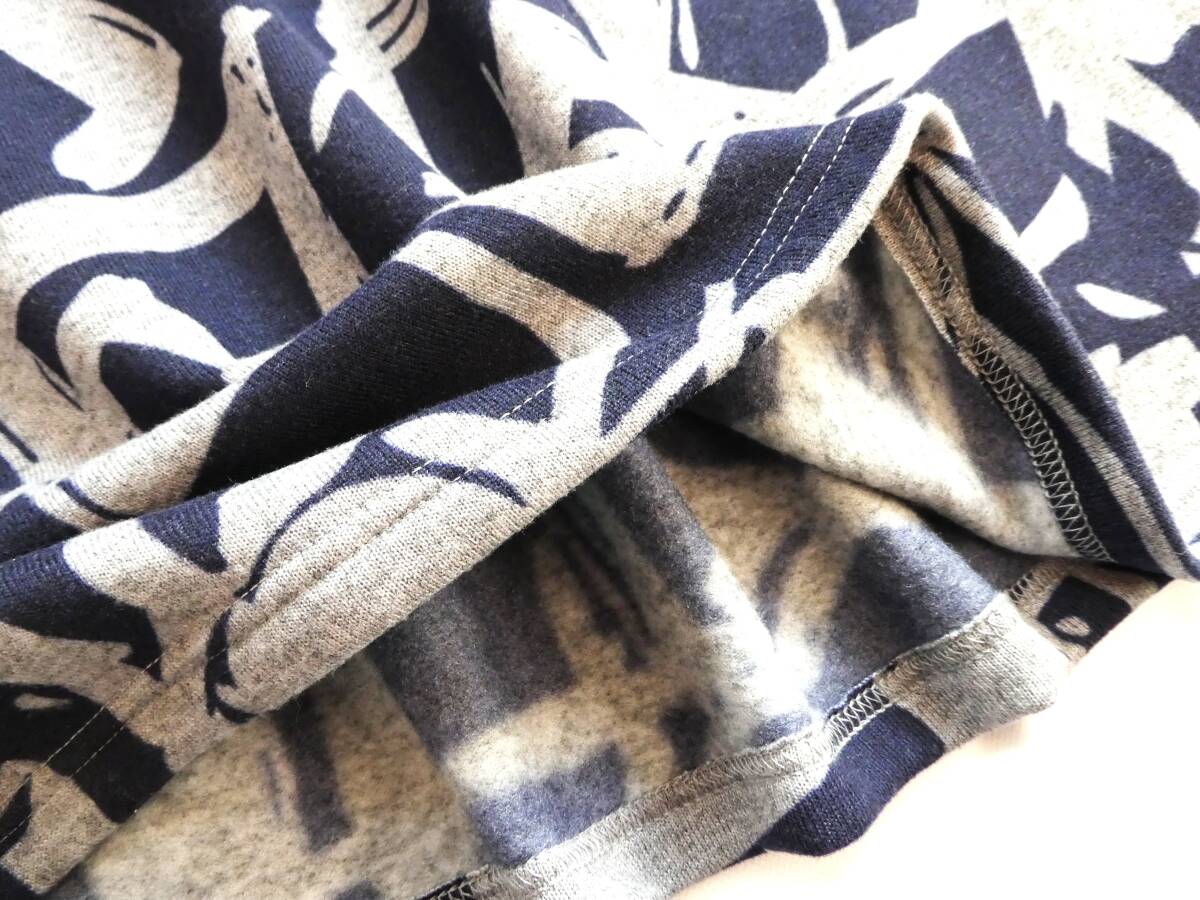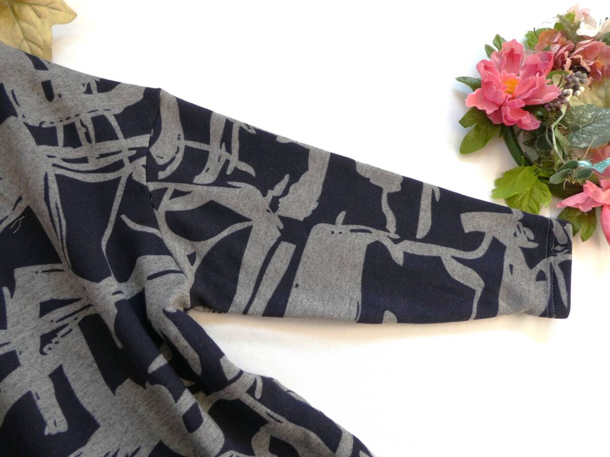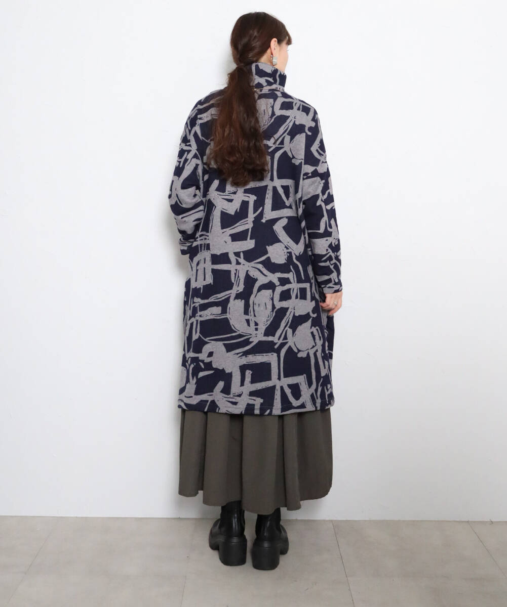 ゆったりサイズ【新品】裏起毛ニットソー素材♪ラインアートmodeプリント◇オフタートルチュニック・ワンピ・ネイビー×グレー◆fit1027◆