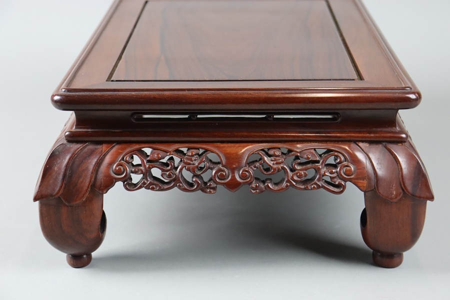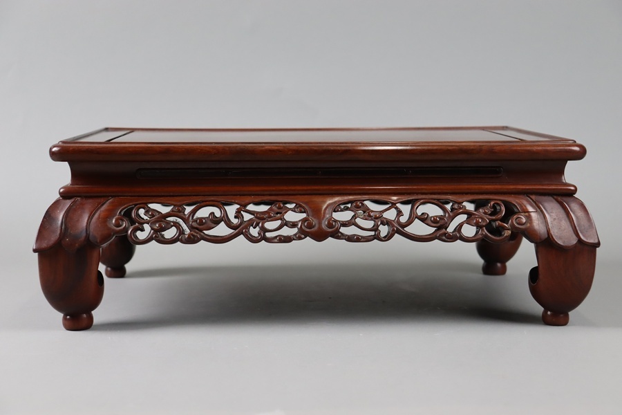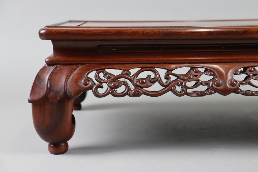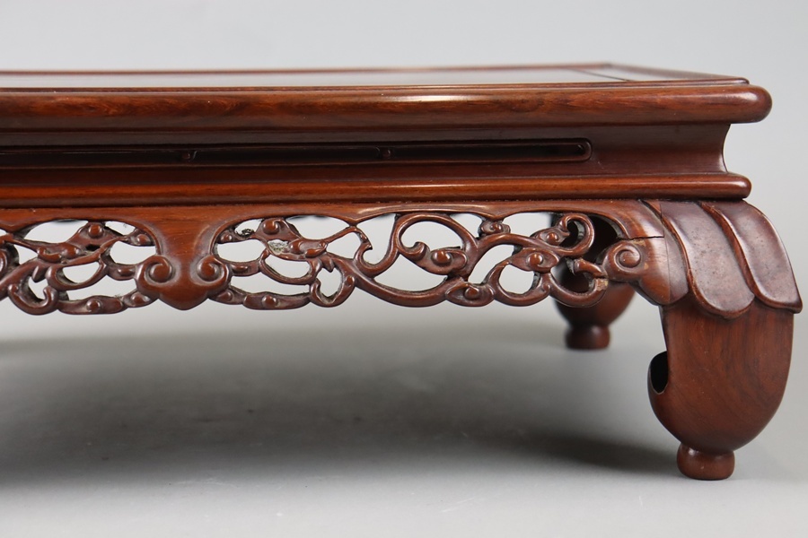 中国古玩 唐木造 紫檀 霊芝透彫刻 花台 幅47,5cm 飾台 盆栽台 香炉台 黄花梨 細密細工 古美術品[d1317]