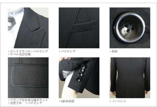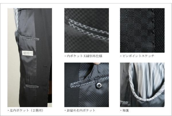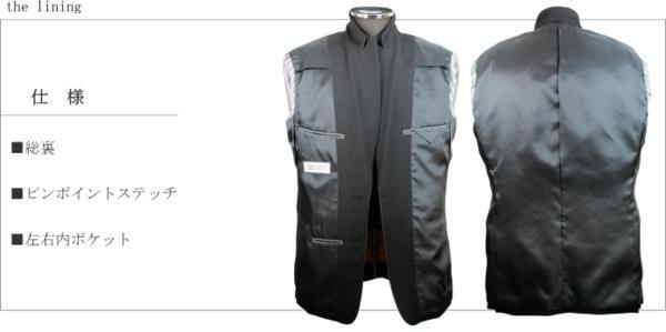 ■上衣:ラペル毛芯仕様、ノーベント、総裏仕様、胸箱ポケット、左右腰ポケット、左右内ポケット、裏地ピンポイントステッチ