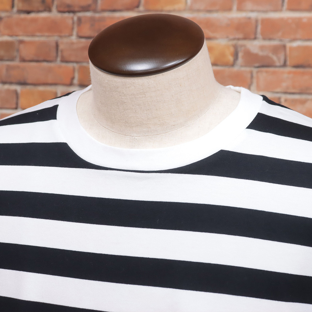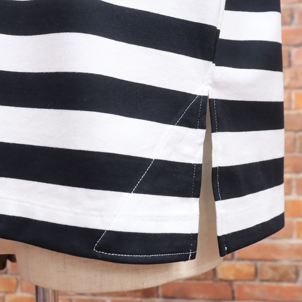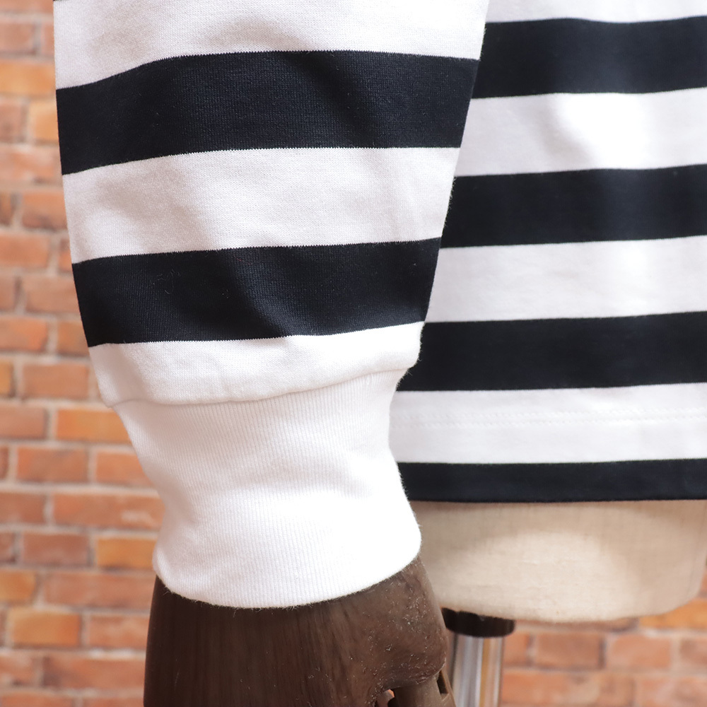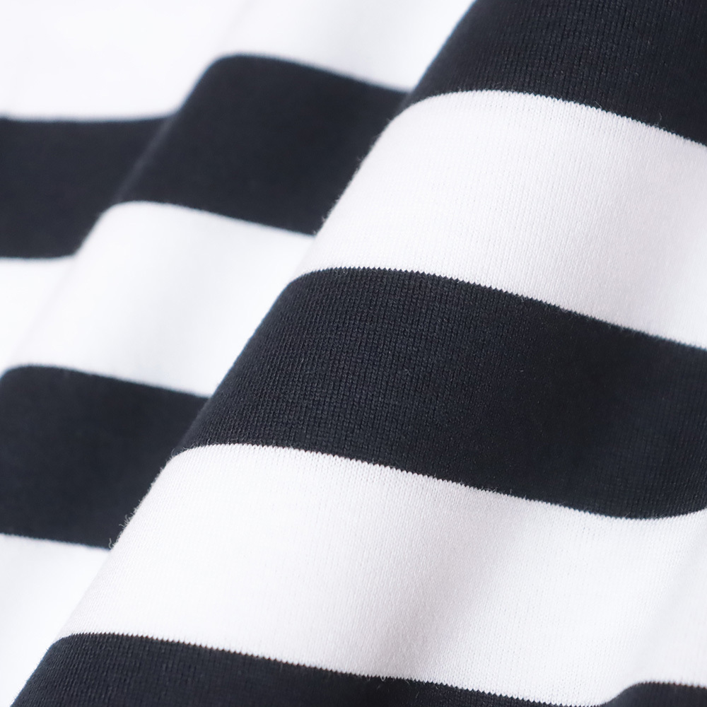 大きめの身幅にドロップショルダー、袖口はリブ仕様でラフに着こなせる長袖Tシャツ。ハイゲージに編むことでハリ感と光沢感が生まれる素材を使用し、カジュアル感がありながら上品に見えるボーダーを表現しました。オリジナル配色のボーダー柄と程よい厚みで、シーズンレスに活躍。首元はバインダーネックで耐久性に優れた仕上がりです。左裾には内側に眼鏡拭きをあしらったクリーンスリットも備え、実用性も◎。シンプルながらスタイリングの幅が広がるアイテムです。